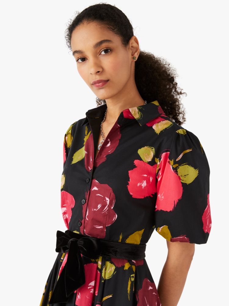 if you ask us, you'd look just rosy in this shirtdress: we gave it puff sleeves and a velvet sash, and added flowers all over. flaunt it at your holiday parties.