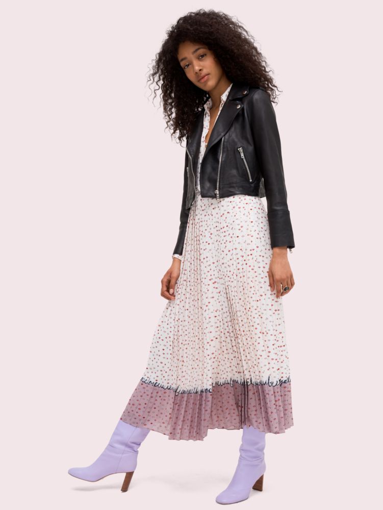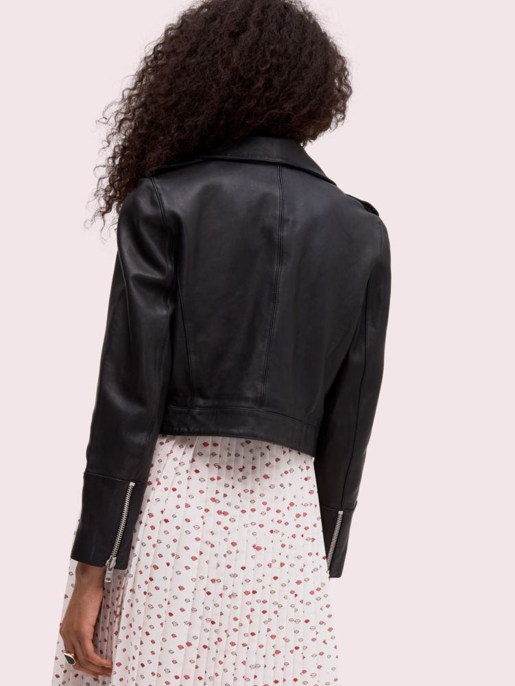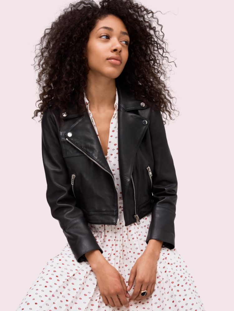 were confident our moto jacket is quite possibly the most perfect take on the leather icon around: its soft, shrunken and incredibly light, so youll be just as comfortable wearing it on day 1 as you will on day 763. it has a sleek, belt-free hem and its lapels are wide--but not too wide. as with a jacket so perfect, it looks just as good with skinny jeans and a tee as it does over a full-length silk pastel dress.