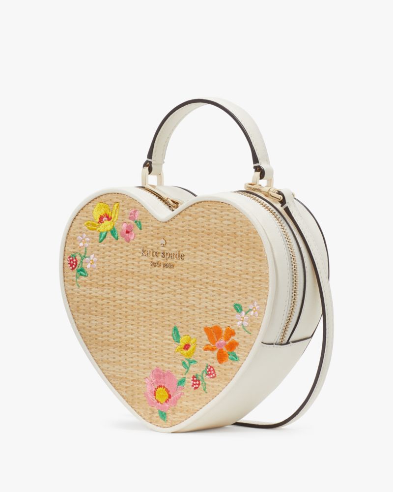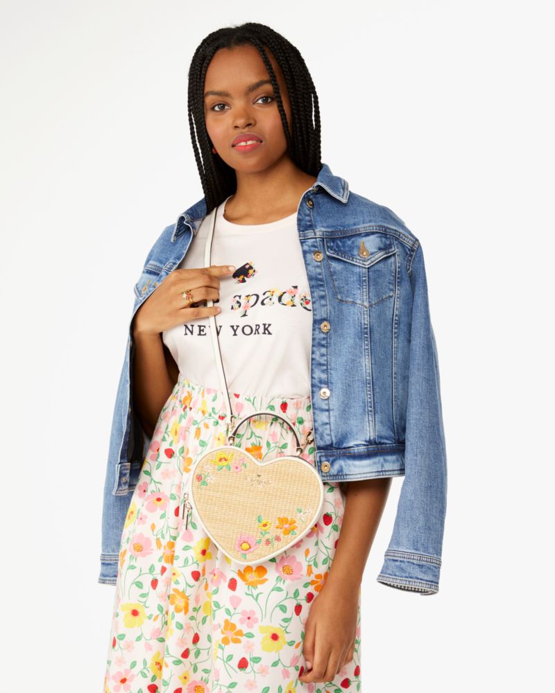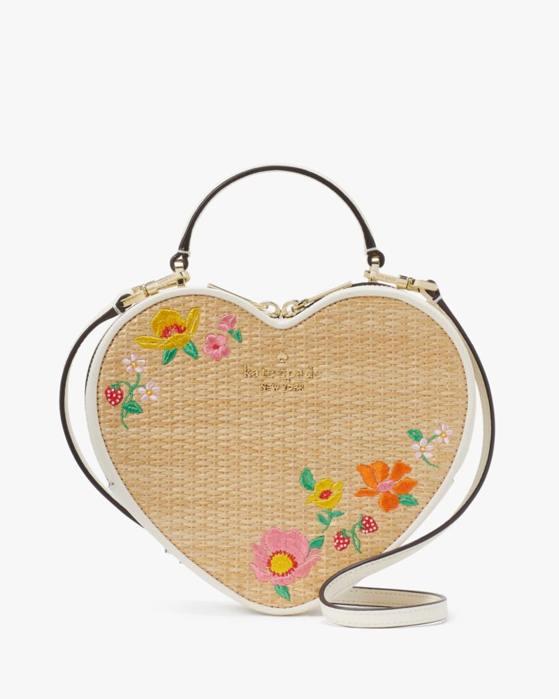 Kate Spade,Love Shack Rattan Heart Crossbody,Lining Leather,Crossbody,Color Block,Embroidered,Logo,Metal,Lined,Day Party,Multi Color