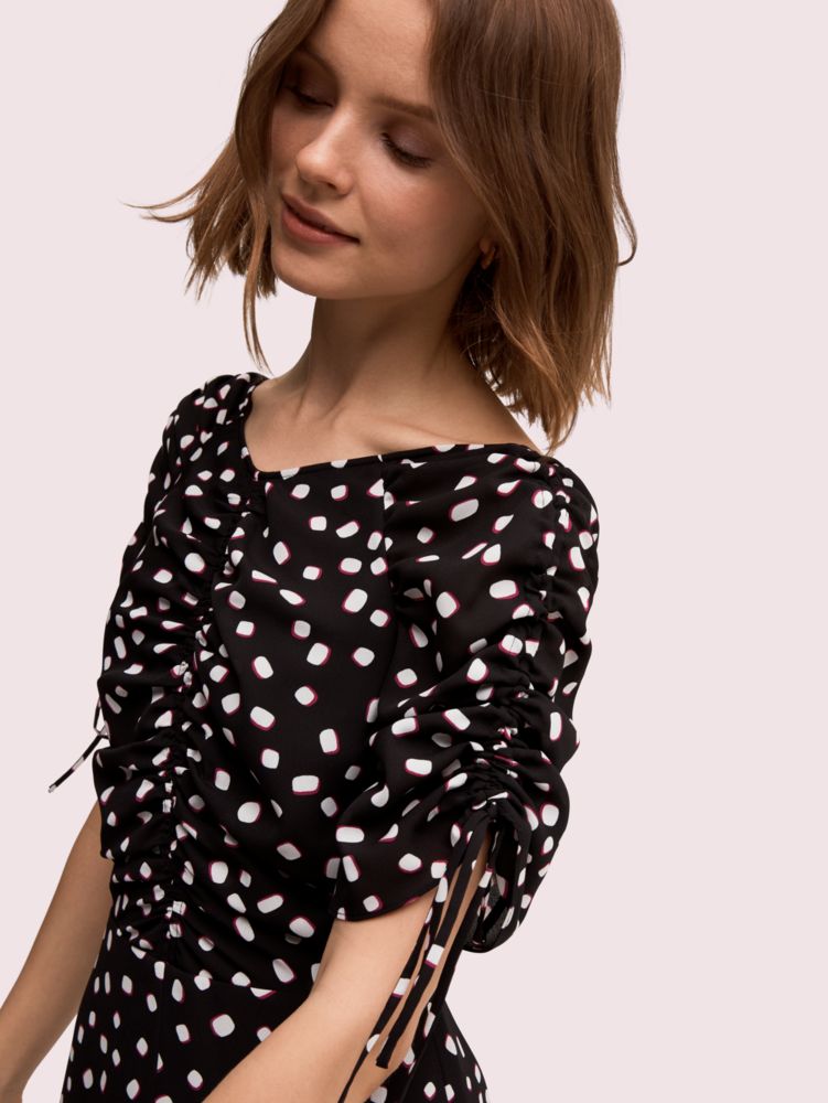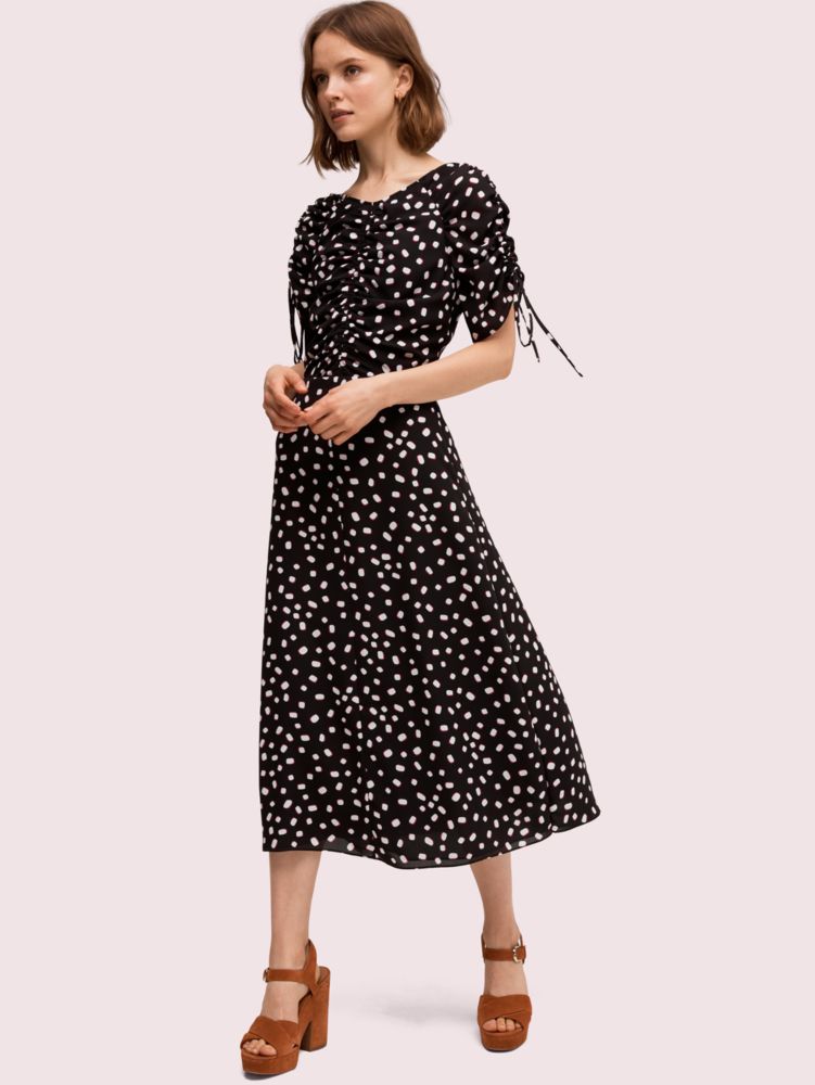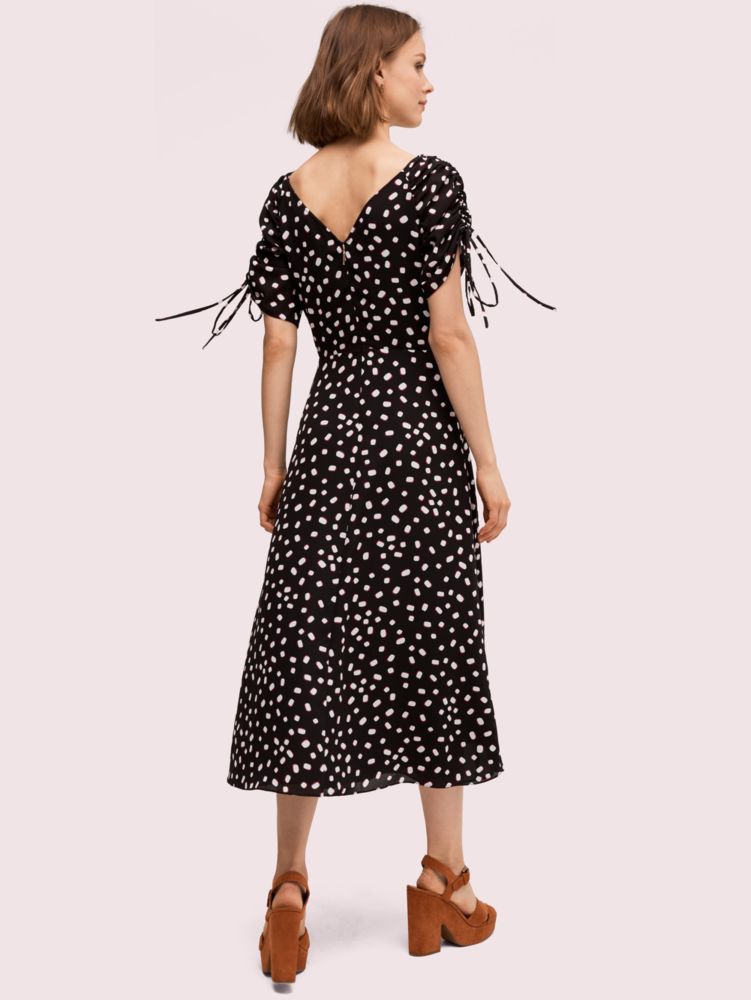 one of our favorite summer activities is roasting marshmallows by the campfire. so we took the sweet, puffy treat and translated it into the dot print on this midi dress. some other important details: the fluid, lightweight georgette that drapes the body so nicely and the feminine ruched detailing at the front and sleeves. and we made the ties at each cuff adjustable, so you can customize the cinching to your liking. we see you wearing this with platform sandals, a leather crossbody and your favorite sunnies.