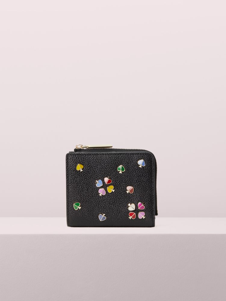 this is the small wallet for your small bag that you've been searching for. we made it in refined grain leather with lots of pockets inside. so while it may be petite, it is highly productive. and for the finishing touch: we embellished it with our beautiful, multicolor enamel spades.