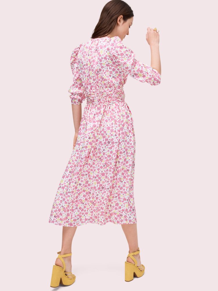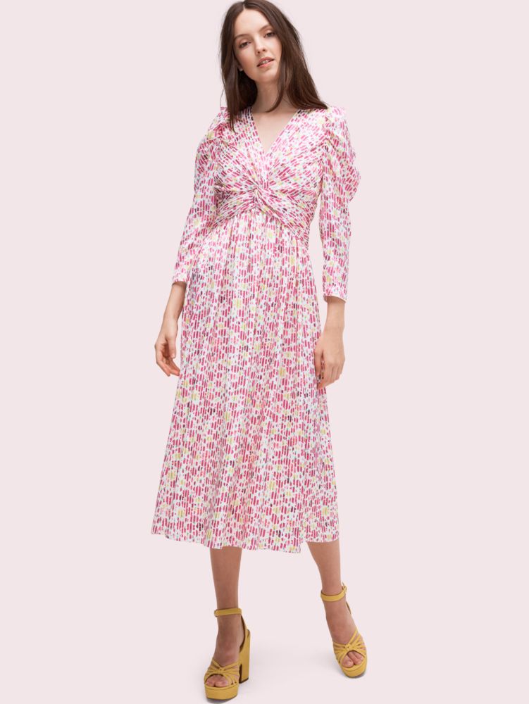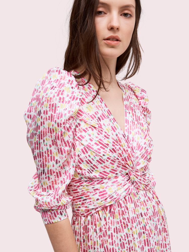 there are so many intricate details on our devore dress. the puff sleeves add dramatic volume, while the v-neck draws your eyes toward the twist-knotted center. we finished it off with our pretty marker floral pattern to add to the overall femininity.