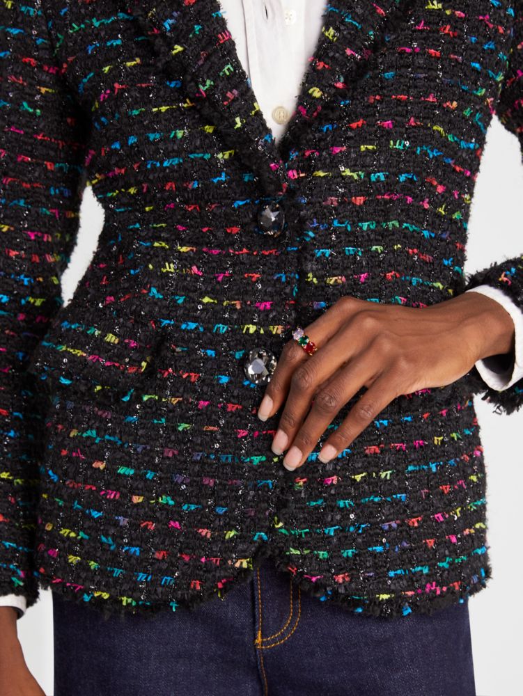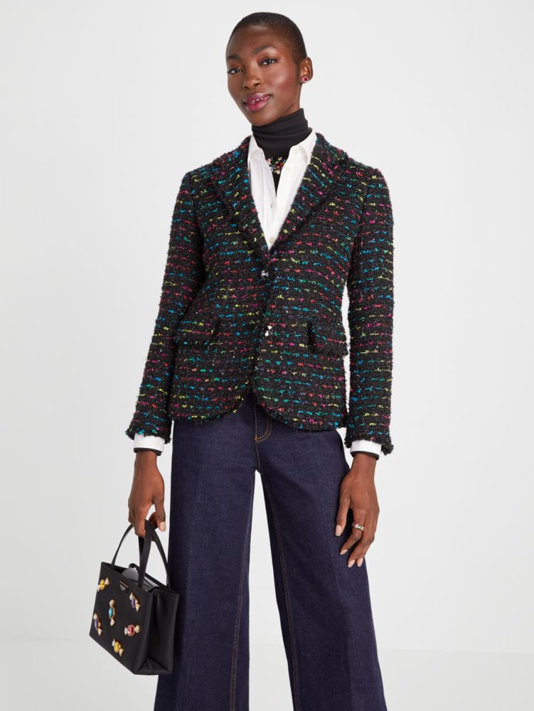 Our take on tweed infuses color and a hint of sparkle into this classic, sophisticated staple. Wear it to the office or as a layer over your going-out look.
