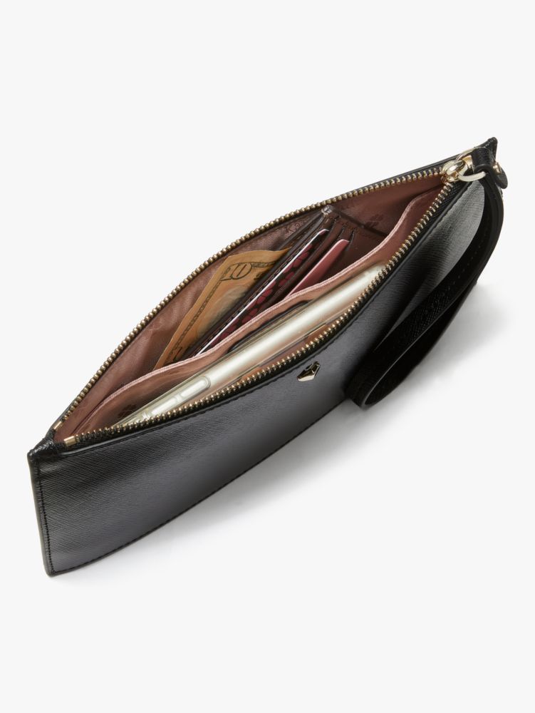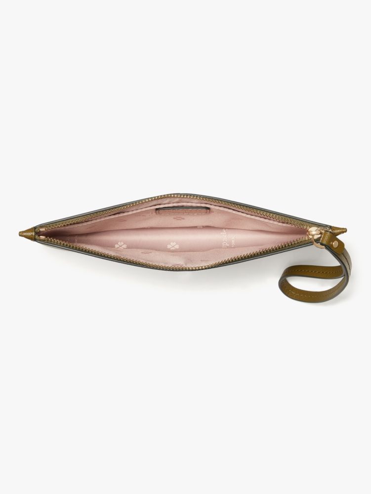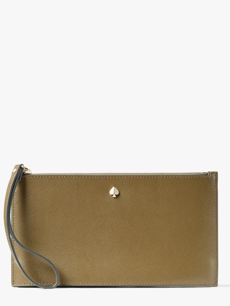 our mila wristlet pouch is done in soft saffiano leather, which means it'll hold up when it's bouncing around the bottom of your bag with all of your other things.