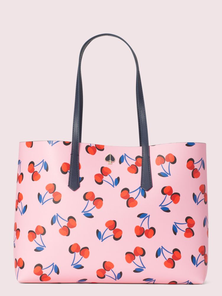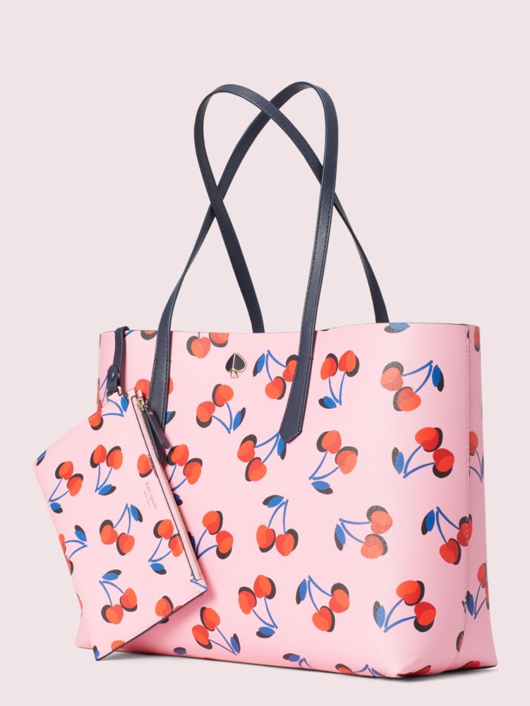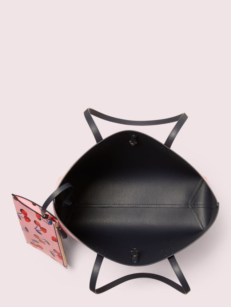 this molly cherries large tote is a playful twist on our favorite everyday bag. crafted from durable faux leather, it's structured with a hint of slouch and extremely lightweight so you can carry all your essentials. a removable pouch snaps in and out for even more storage space.