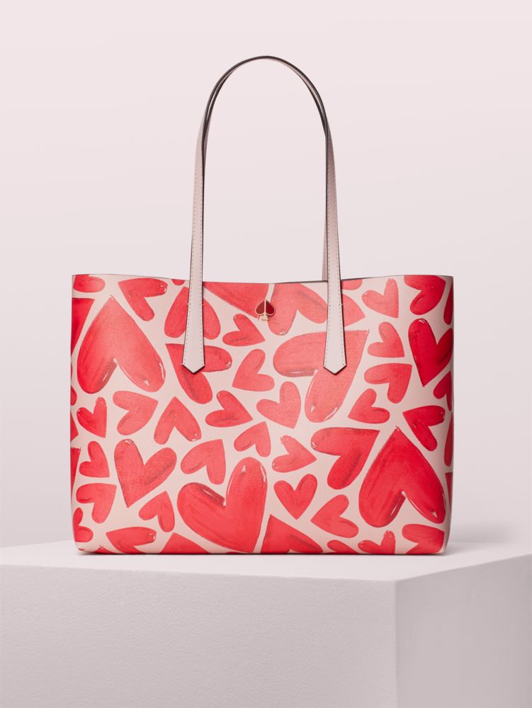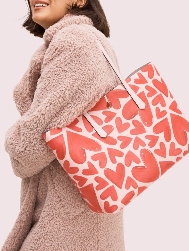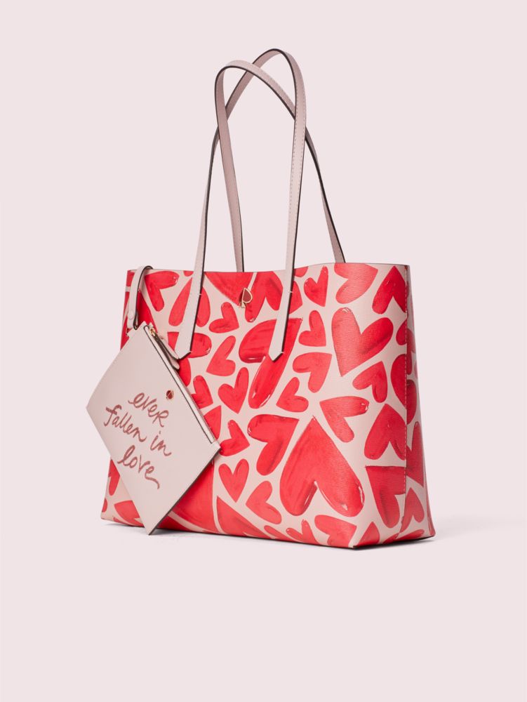this molly ever fallen large tote is a sweet twist on the everyday bag. crafted of heart-print faux leather, it's structured with a hint of slouch and extremely lightweight so you can carry all your essentials. a removable pouch printed with "ever fallen in love" snaps in and out for even more storage space.