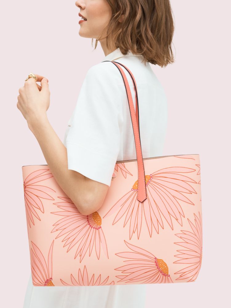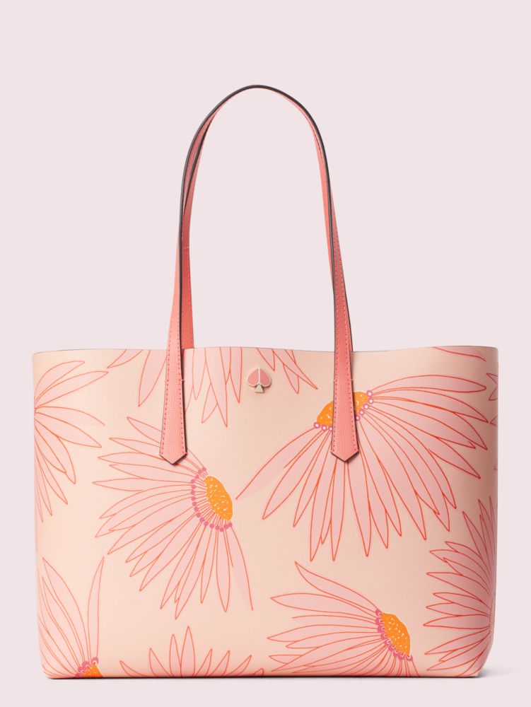 this molly falling flower large tote is a feminine twist on our favorite everyday bag. crafted of durable faux leather in a colorful flower motif, it's structured with a hint of slouch and is extremely lightweight so you can carry all your essentials. a removable pouch snaps in and out for even more storage space.