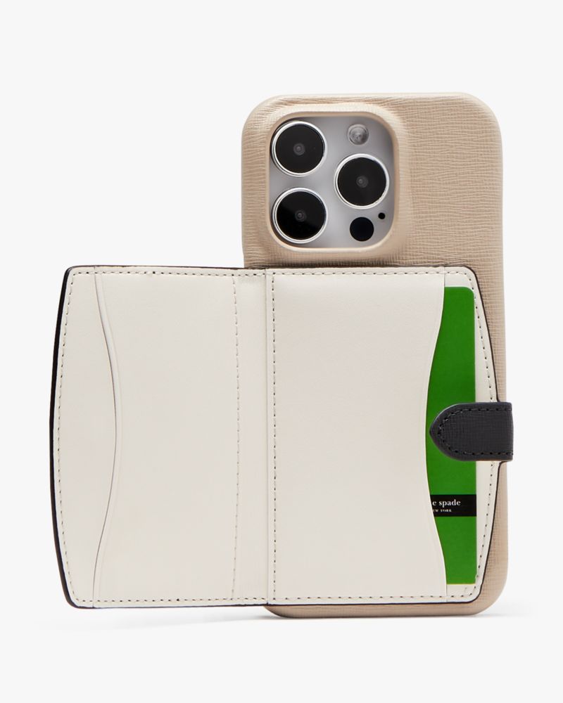 Made from colorblocked Saffiano leather, this elegant phone case features a cardholder so you can stash your cards on the go.