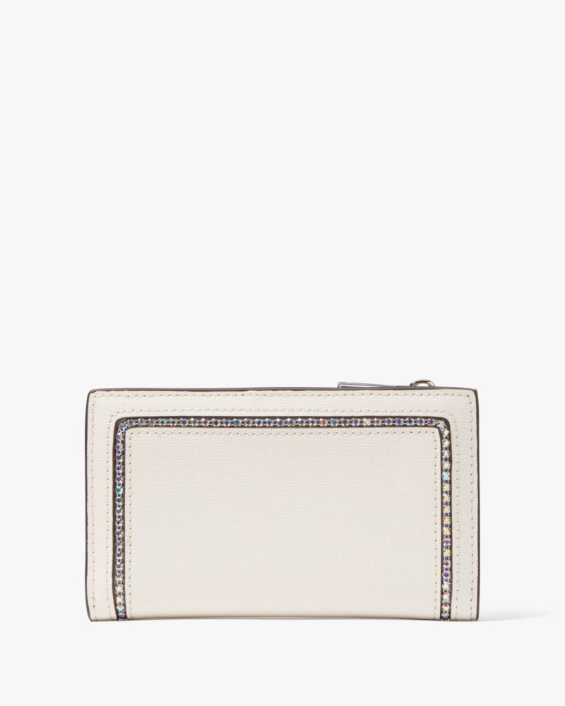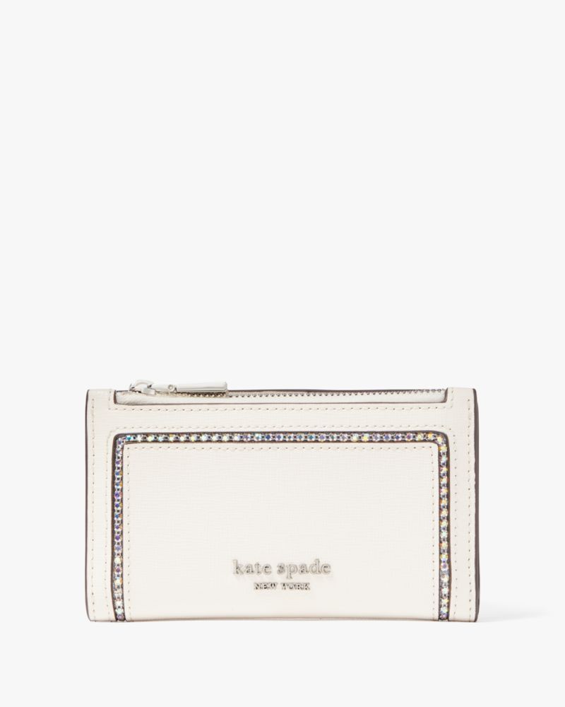 Designed for a compact silhouette, our Morgan wallet goes everywhere with you. It's made from scratch-resistant Saffiano leather with sparkling crystal inlay accents.