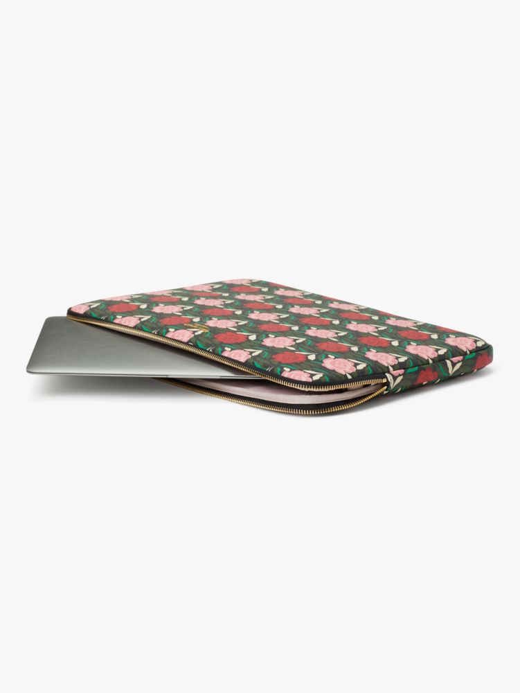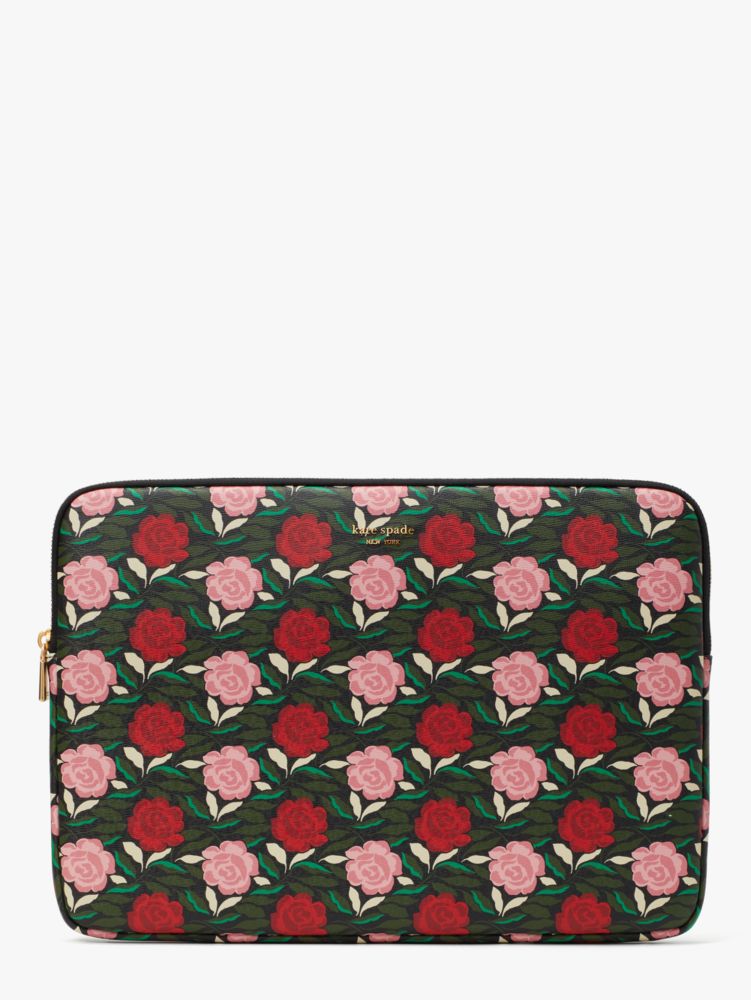 We consider this sleeve a purse for your laptop. That will help contextualize why we gave it the same thoughtful details as any other handbag we make. It's done in our Rose Garden print faux saffiano leather to withstand scratches and mishaps--because stuff happens. And it's a universal size so it fits all laptops, which means you won't have to upgrade when you get a bigger or smaller computer.