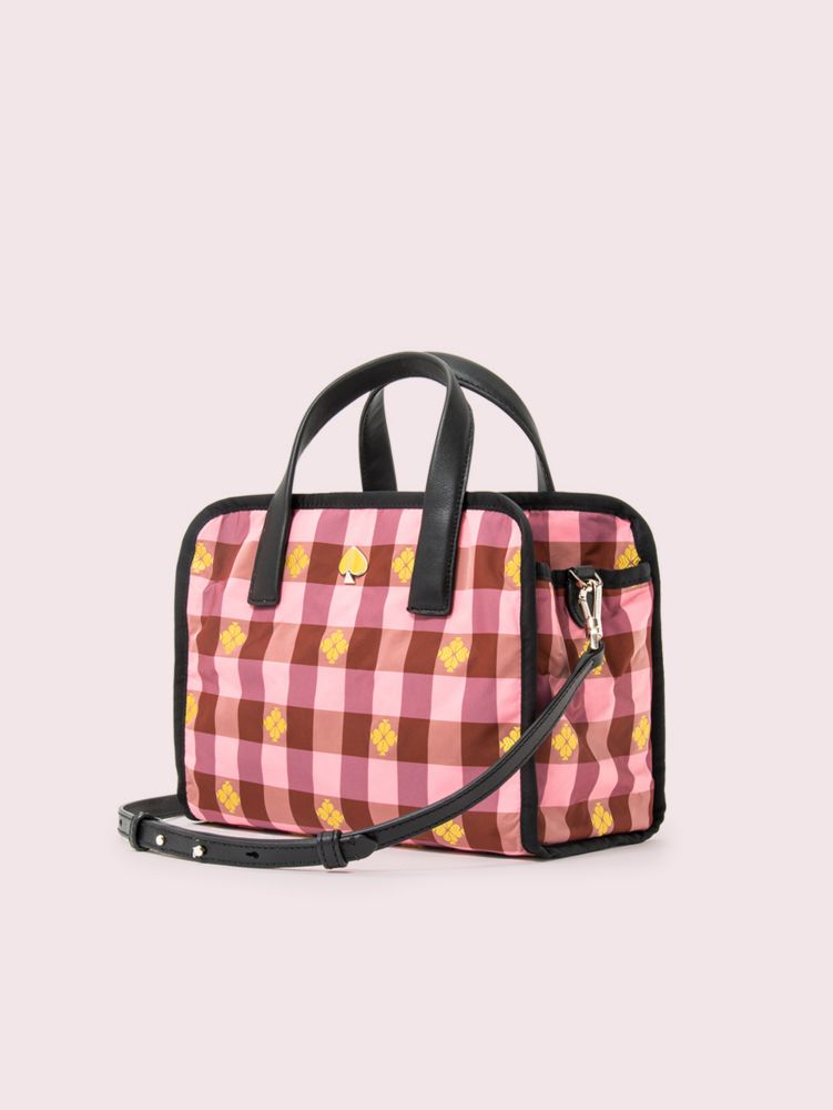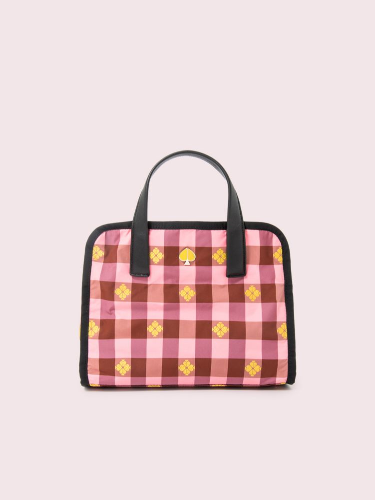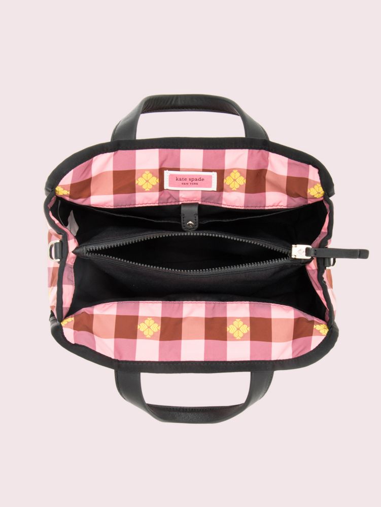 there's a sophisticated, feminine and unexpected mix of colors on the morley medium tote--one of our most joyful bags in the collection. made from embroidered Italian nylon, it’s finished with an enamel spade and pretty grosgrain trim. a snap tab slip pocket inside provides space for both of your phones (or anything else you'd prefer to slip in). we love it for travel, weekend outings and wearing it alongside a smaller bag to carry bigger essentials.