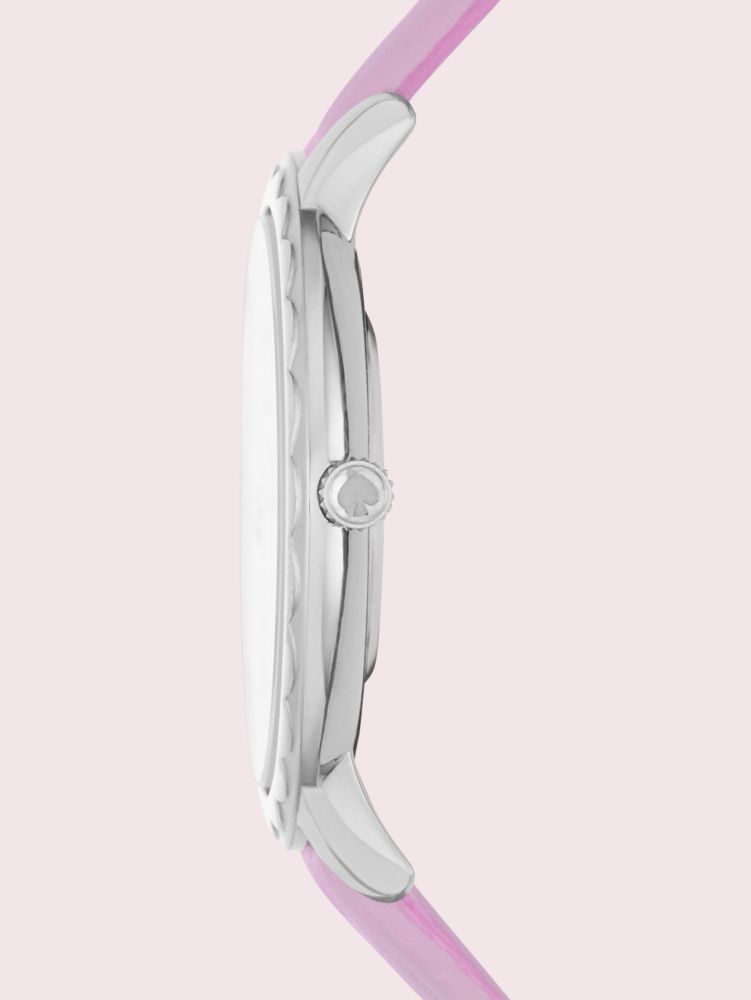 one of our favorite trends right now is colorblocking--so we couldn't resist adding a pretty orange and lilac bicolor design to this 38mm morningside watch. It also features a silver-tone scallop topring, three-hand movement and a leather strap. we replaced 12 o'clock with our signature spade for the finishing touch.