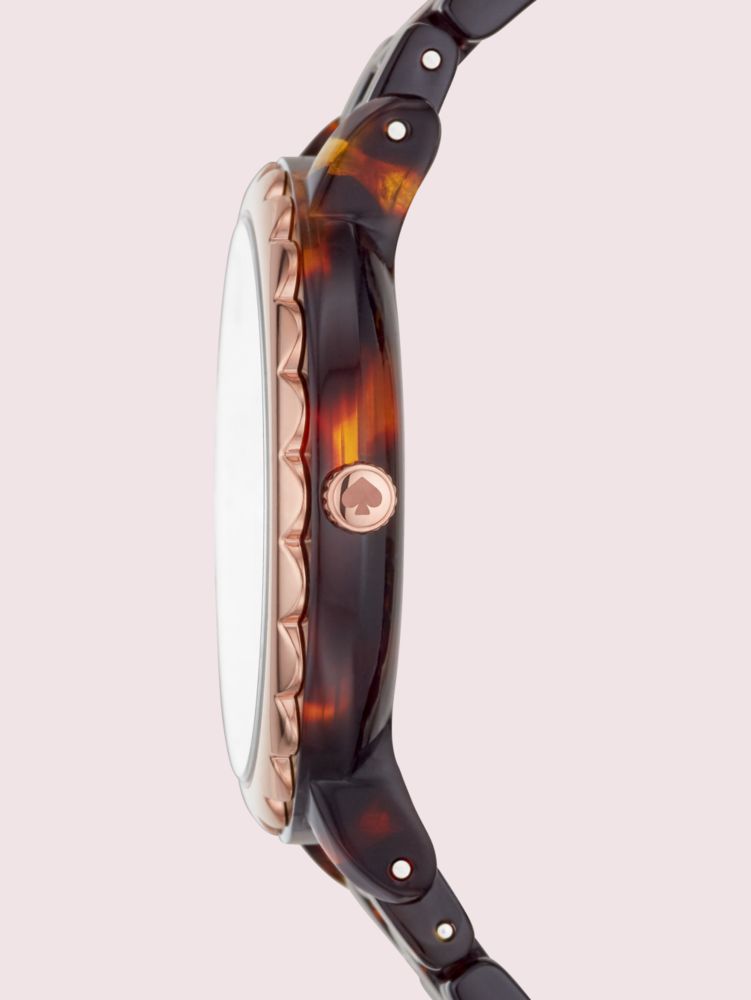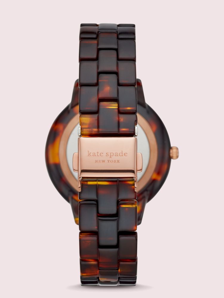 our 38mm morningside watch features a brown sunray face, rose gold-tone dot indexes and a sophisticated tortoiseshell acetate three-link bracelet. it's a timeless piece finished with a playful twist: a rose gold-tone scallop-shaped topring.