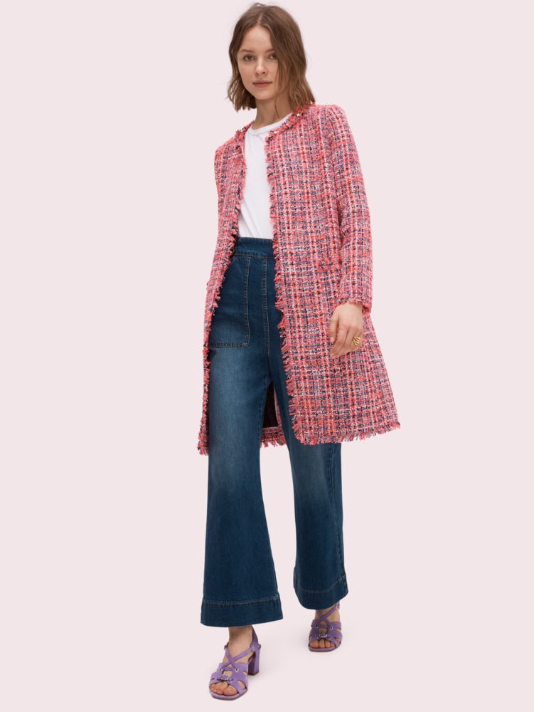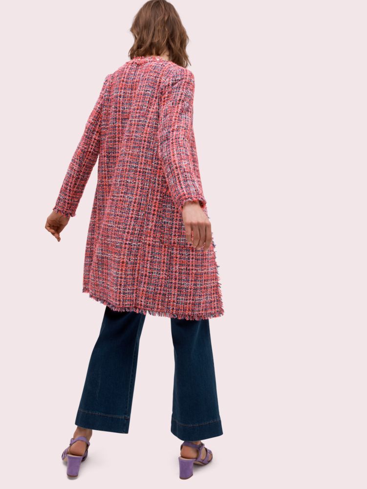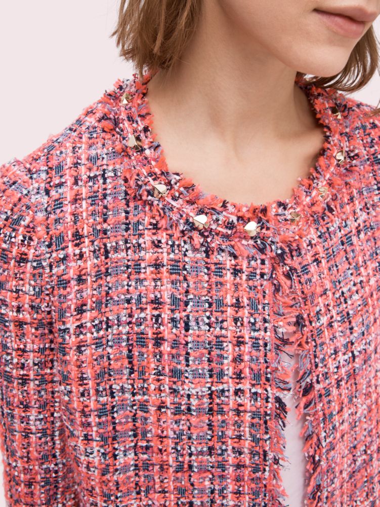a little secret about our tweed: we weave paper yarn (its that one made by twisting long ribbons of washi paper) into our unique multi-yarn, multi-color formula. theyre like little festive, fancy streamers that give this classic open front coat its beautiful texture and dimension--and so do a trim of spade studs along the neckline.