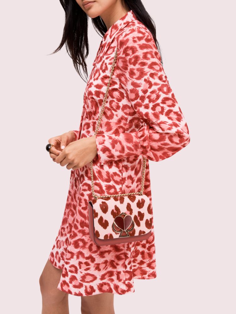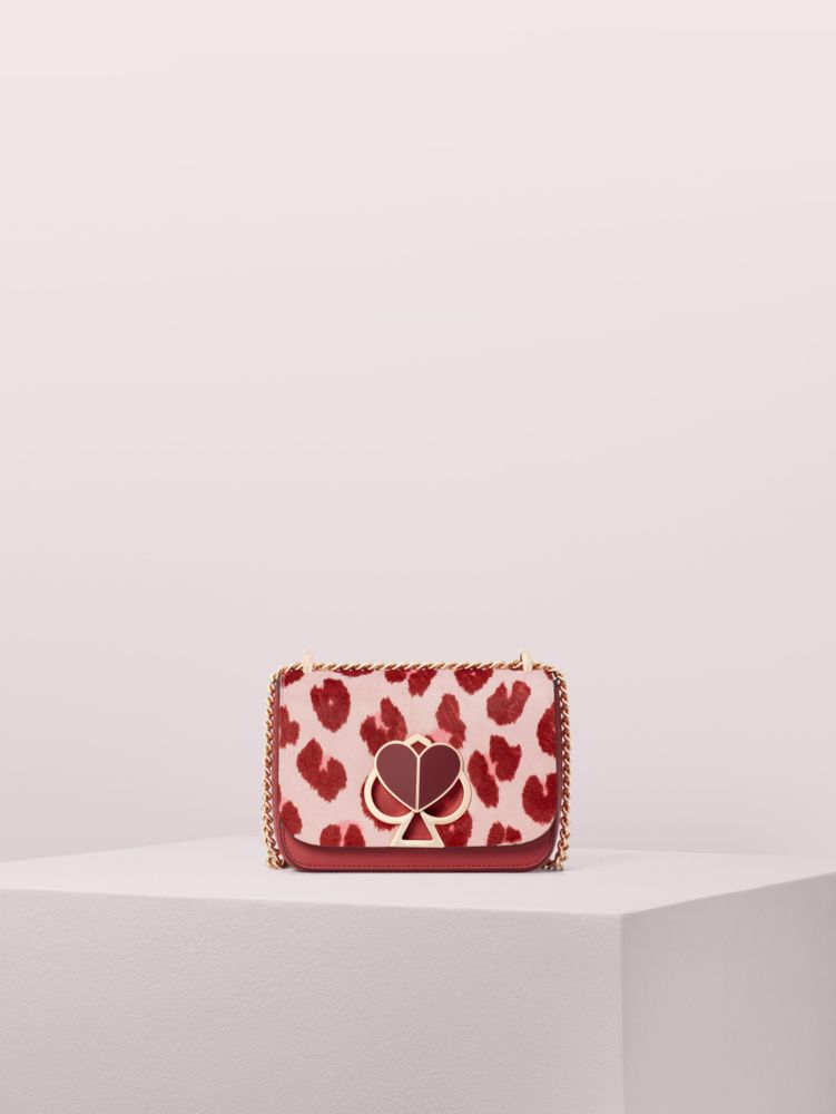 as seen on our fall 2019 runway: the nicola twistlock small convertible shoulder bag in luxe calf hair printed with fierce leopard spots. true to the original handbag of the same name, its strong silhouette is balanced with soft, feminine details like rounded corners and refined, jewelry-like hardware, including a beautiful chain strap that doubles for a shorter look. a spade heart twistlock with a (very) satisfying 'click' closure adorns the front; the plunge on the back slip pocket is a seductively subtle nod to the curves of our signature mark. inside, a zipper pocket and additional slip pocket keep your essentials organized.