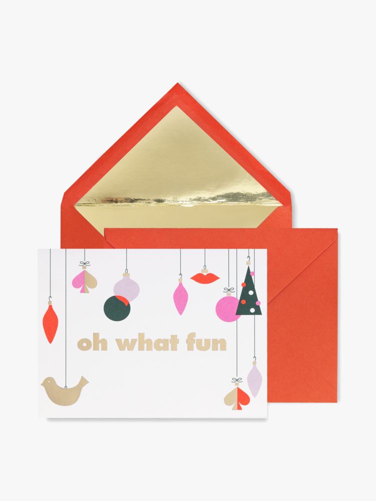 when giving holiday gifts, remember: it's really the thought that counts. even sending a nice card says a lot. this set features 10 cards and lined envelopes playfully detailed with a colorful ornament motif and "oh what fun" lettering.