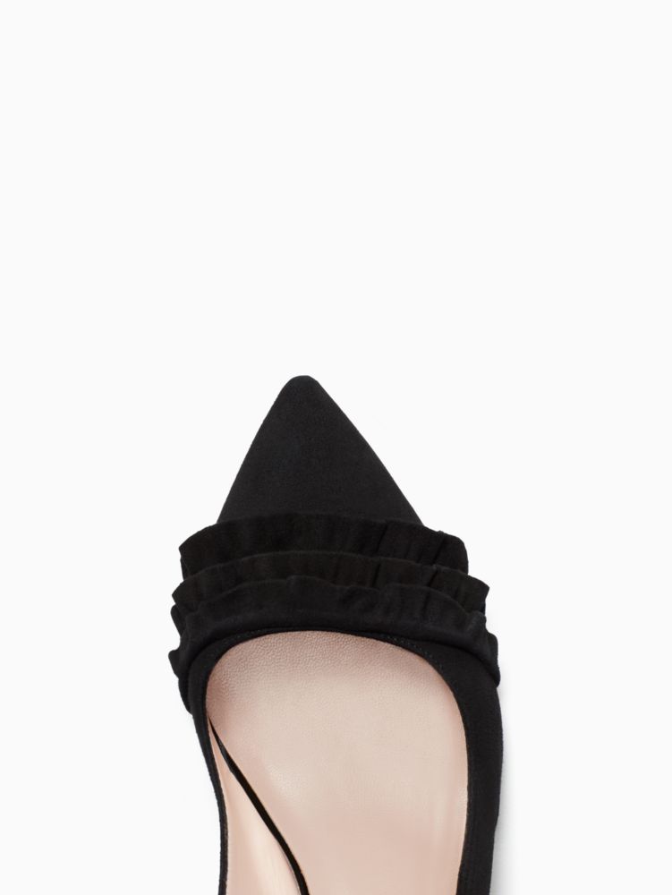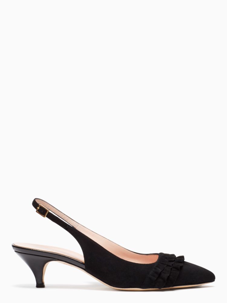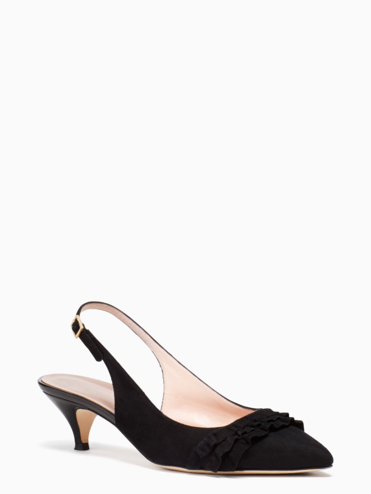 consider our slingback kitten heels your plus one for any event this holiday season. finished with festive ruffles that remind us of the rockettes, they're equally delightful with tuxedo pants or a favorite party dress.