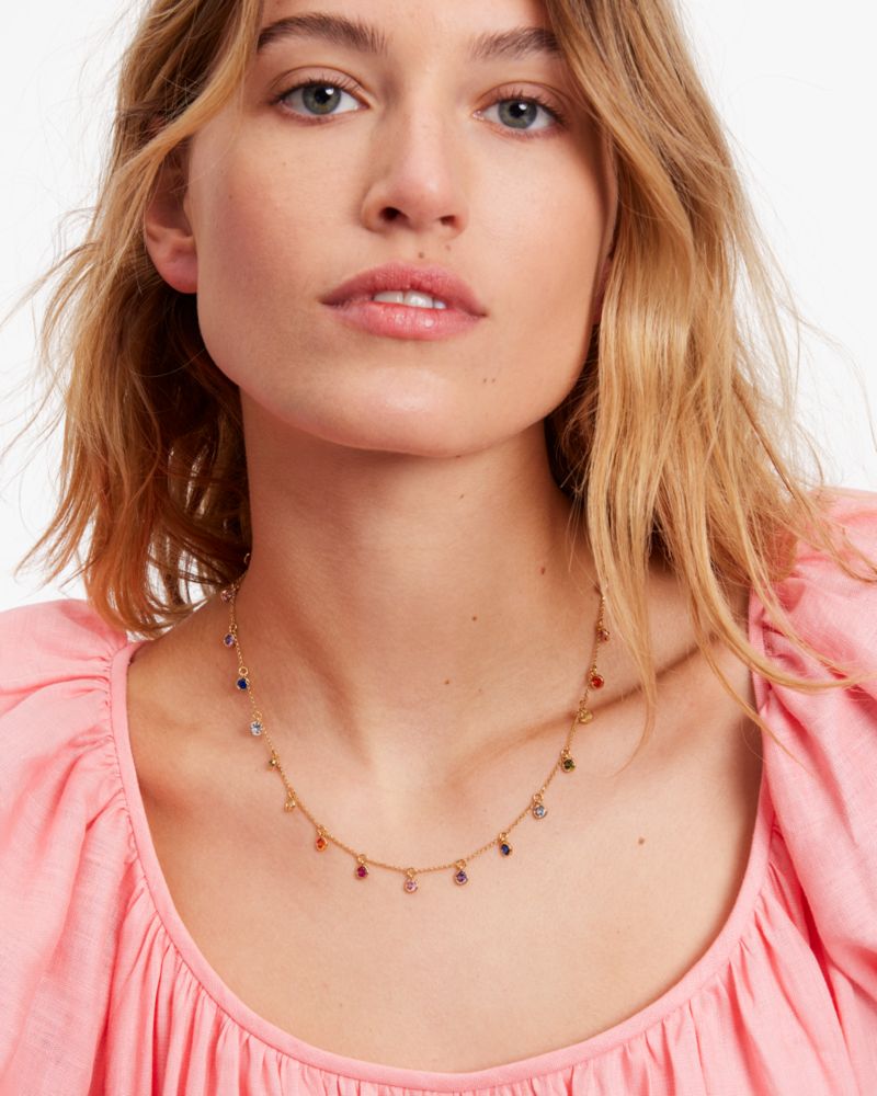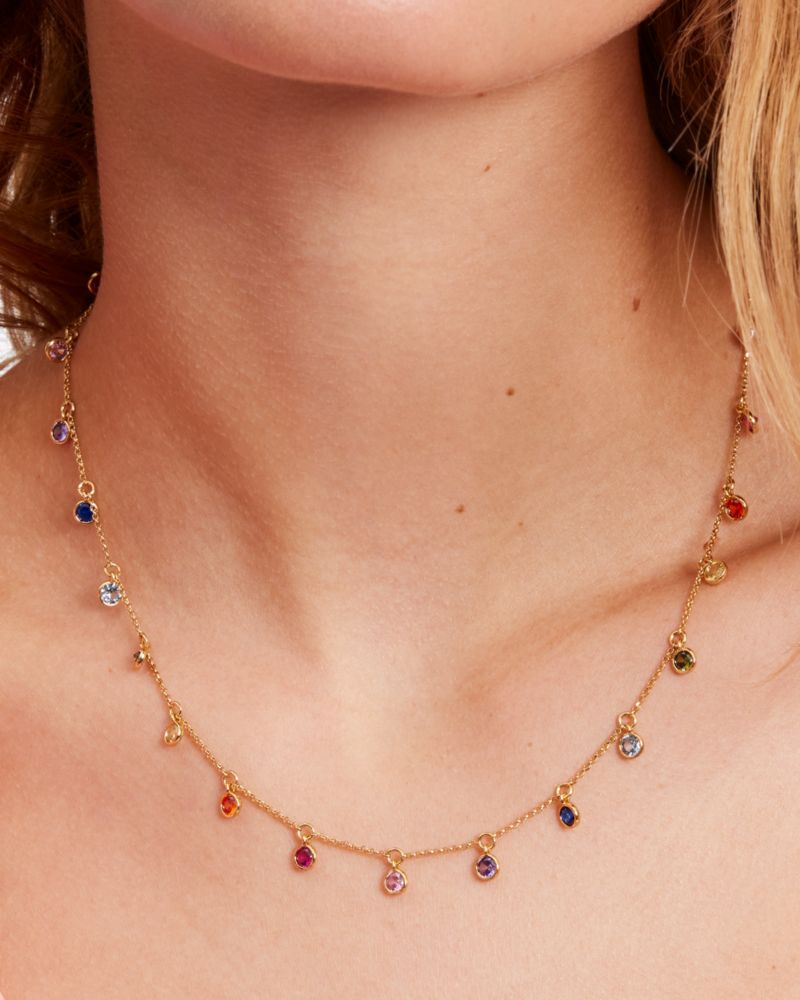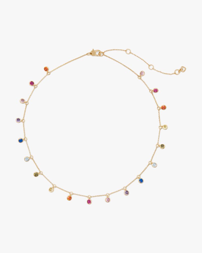 Live colorfully: this necklace is strung with rainbow-jeweled dots for a vibrant look.