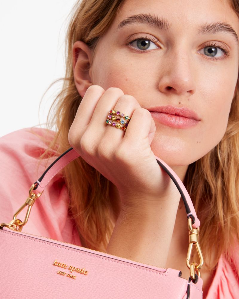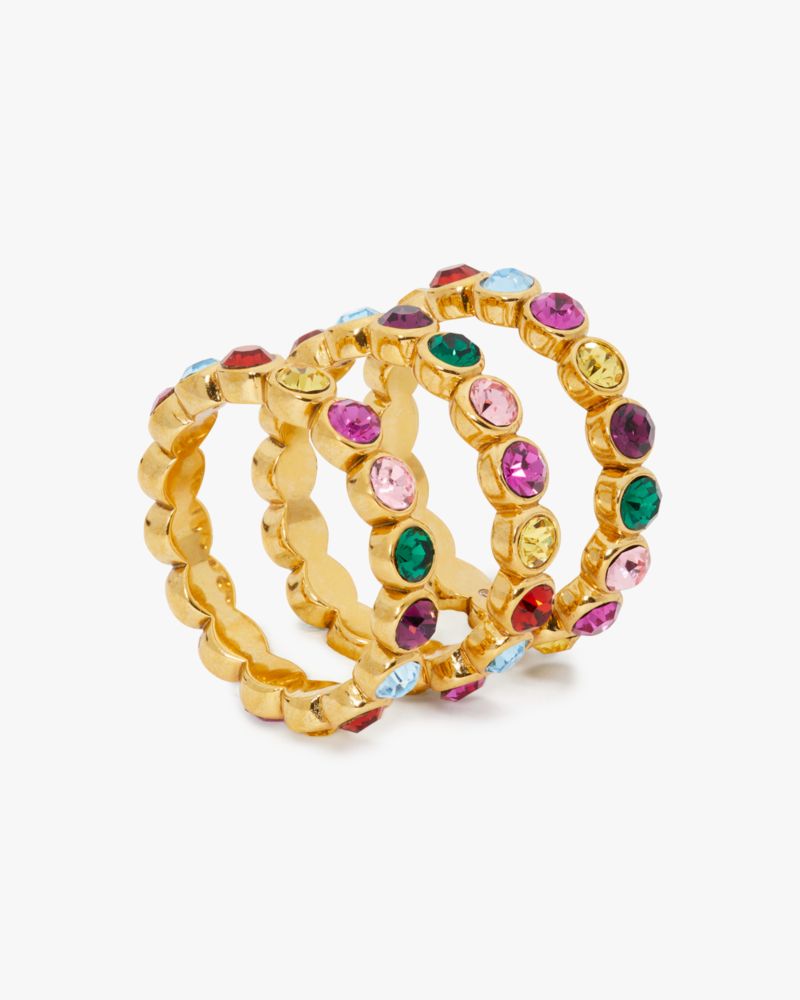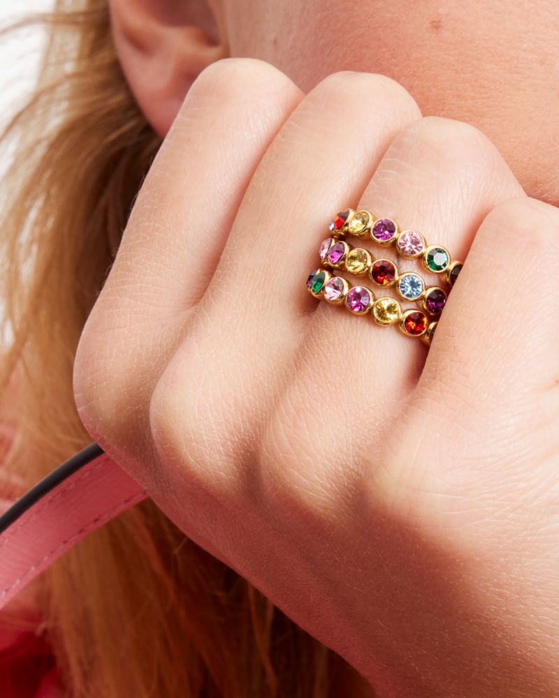 Adorn your hands with these stacking rings featuring bezel-set rainbow crystals.