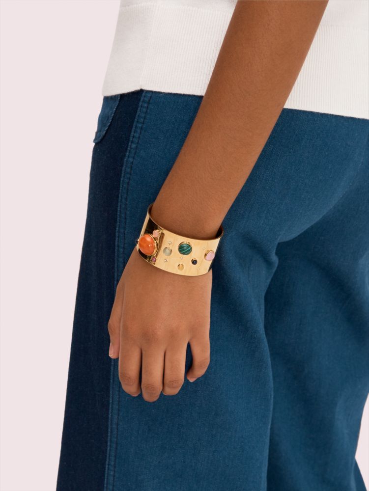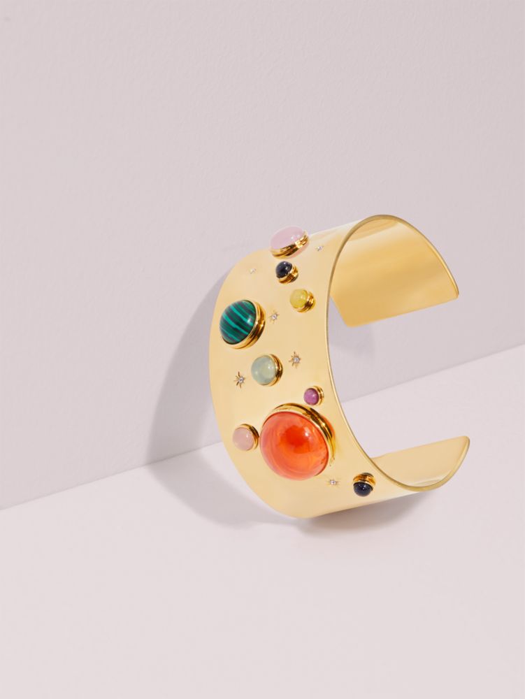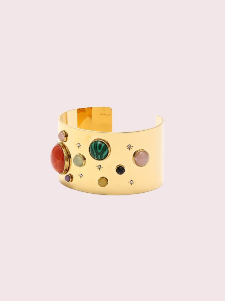 our on the rocks collection features playful design details done in the most sophisticated way. this thick cuff, which we've handcrafted of 12k gold-plated metal, is adorned with tiny pavé stars and multicolored semiprecious stones. it'll add a whimsical touch to all of your looks.