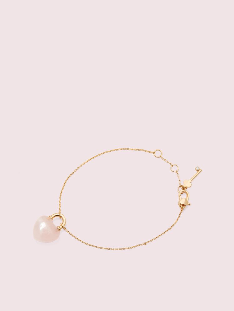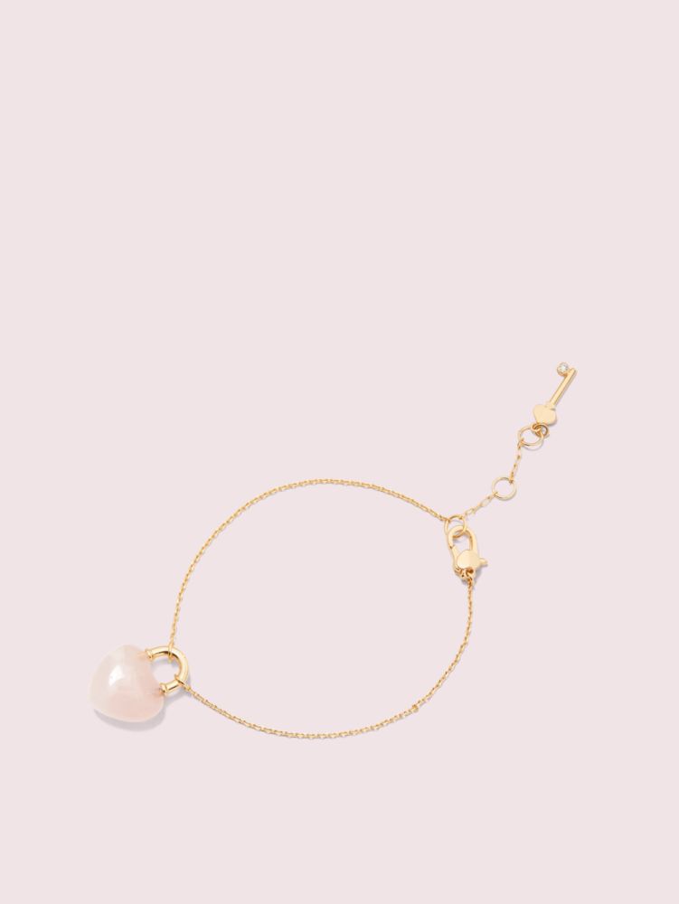 our open heart collection features a range of dainty jewelry in gold-plated metal punctuated with semi-precious stones like rose quartz and line agate. this stone lock bracelet, hand-carved in the shape of a heart padlock, suspends from a slender chain that adjusts for the perfect fit. it'll add a feminine finishing touch to any look and will stack nicely with the other bracelets in your jewelry box.