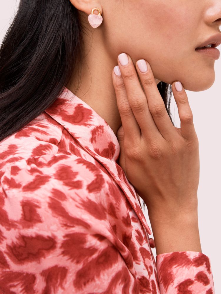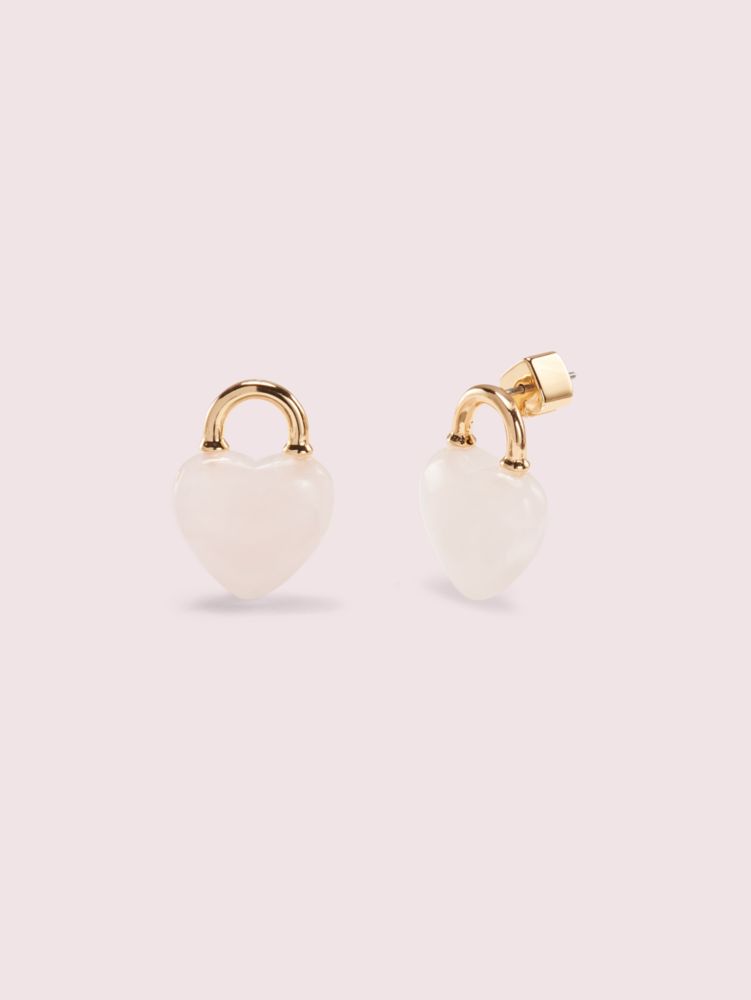our open heart collection features a range of dainty jewelry in gold-plated metal punctuated with semi-precious stones like rose quartz and line agate. these stone lock studs, hand-carved in the shape of heart padlocks, will add a feminine finishing touch to any look and will pair nicely with the other earrings in your jewelry box.