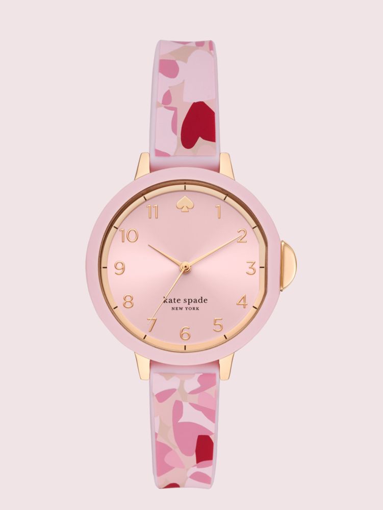 featuring a comfortable silicone strap, our 34mm park row watch is accented with classic details like a pink sunray face, rose gold-tone numeral indexes and a pink and rose gold-tone topring. the red and pink heart print is a feminine finishing touch.