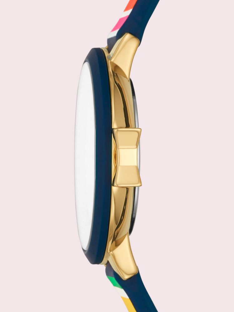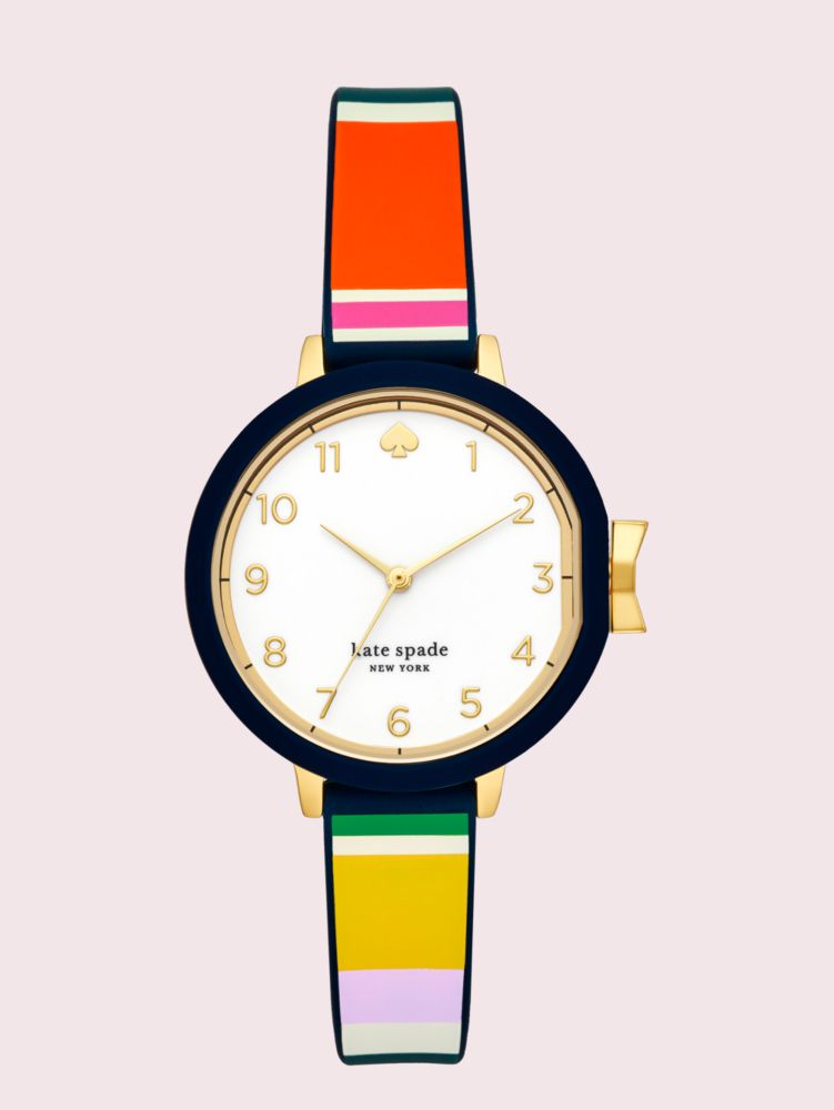 we can't decide what we love more about our 34mm park row watch: the glossy white face, the elegant gold-tone numerals, or the colorful striped leather silicone. Make sure to zoom in on 12 o'clock. we replaced it with our signature spade for the perfect finishing touch.