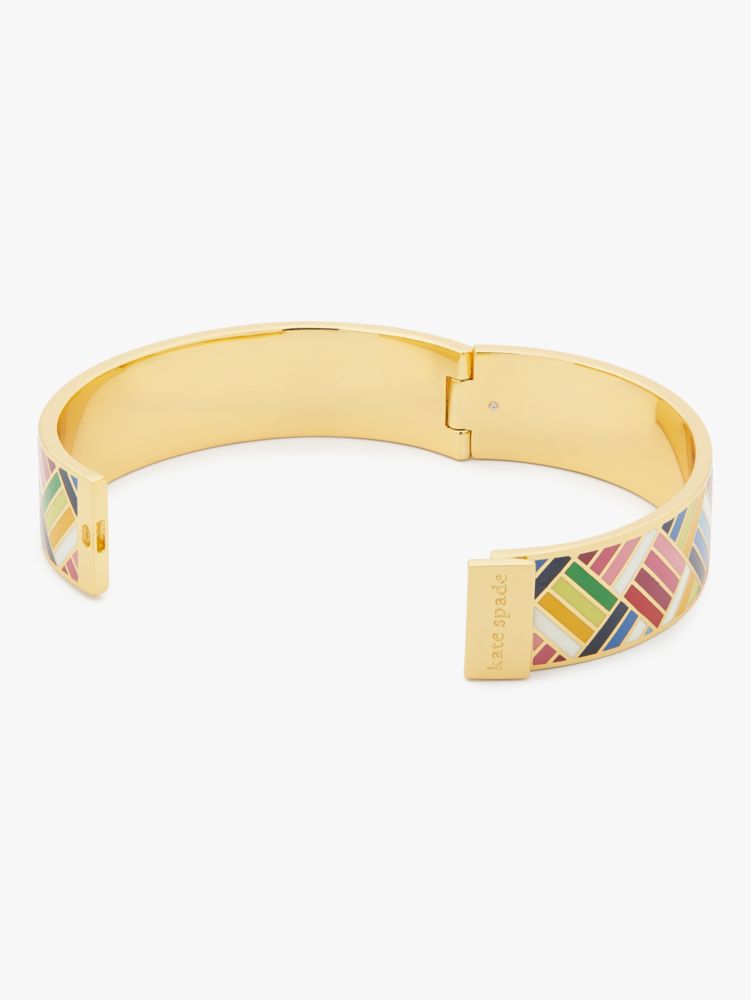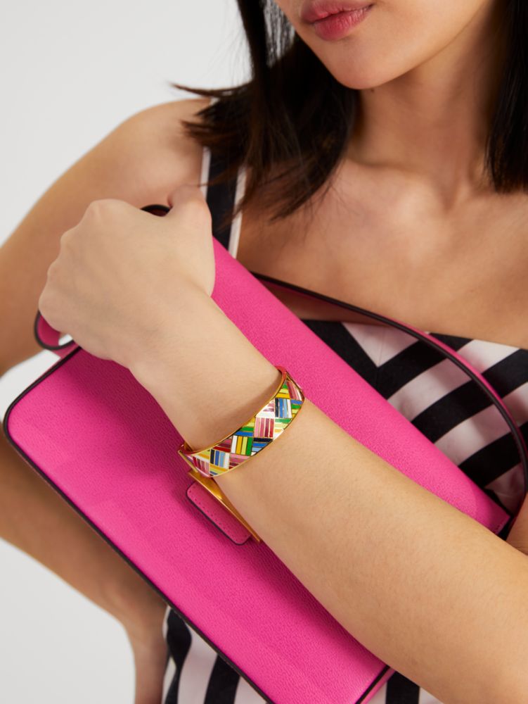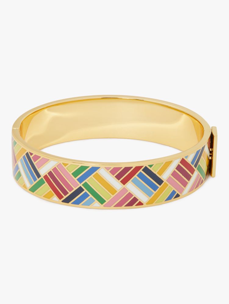 Piece your look together with this colorful enamel bangle featuring an intricate patchwork pattern.