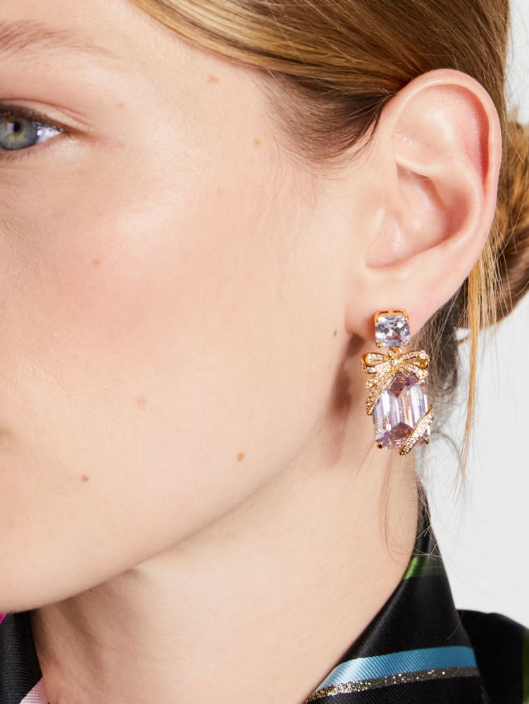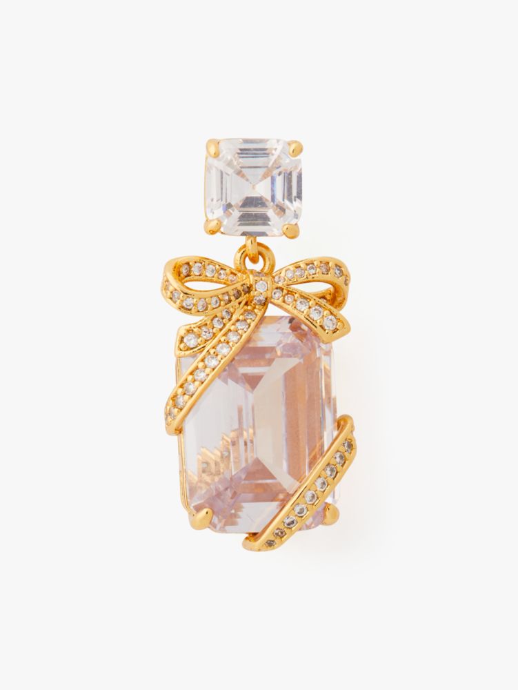 Give the gift of sparkle: these drop earrings feature emerald-cut crystals wrapped in a pavé encrusted ribbon. (How fancy!)