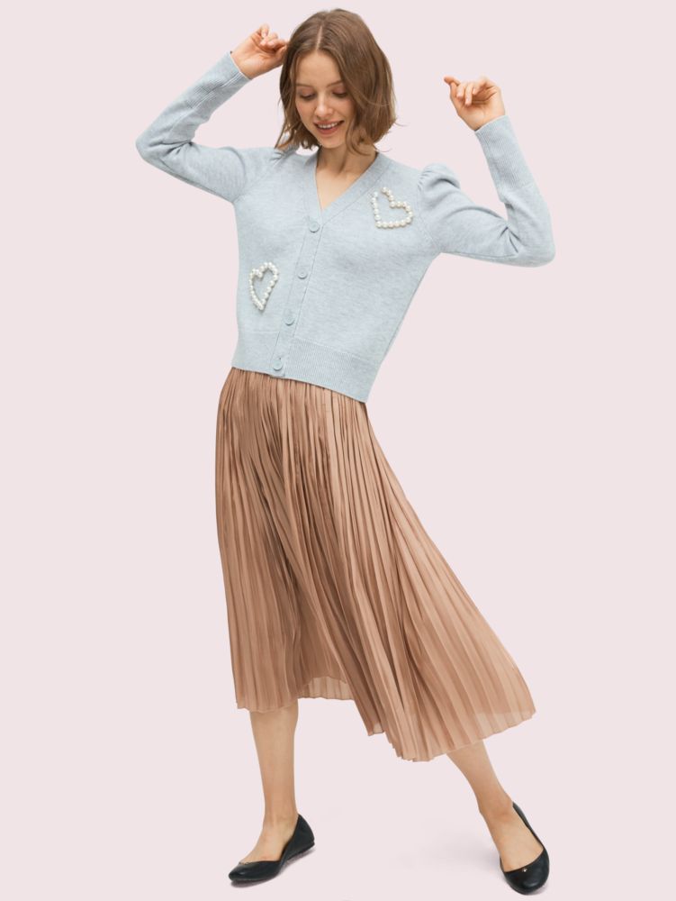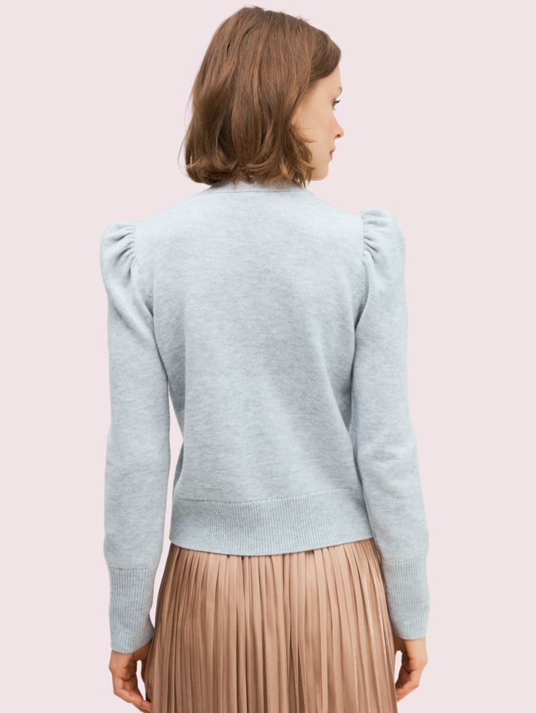 we scattered this soft wool-blend cardigan with faux pearls in the shape of hearts and finished it with stylish puff sleeves for a playful spin on a classic. try it with a skirt and flats or keep it casual with jeans and sneakers.