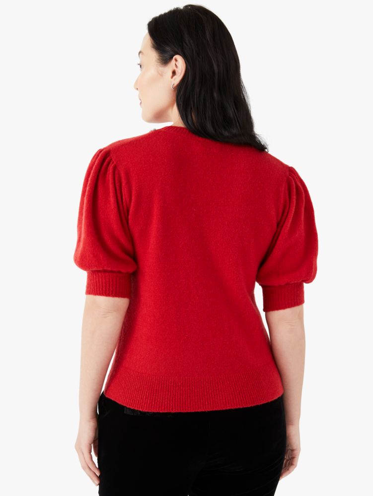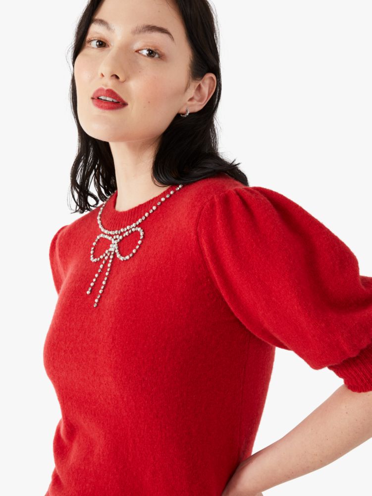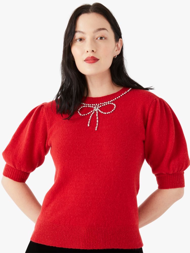 sometimes you have to ask yourself: what would audrey wear? this puff-sleeve sweater embellished with a pearl and rhinestone bow, for one...