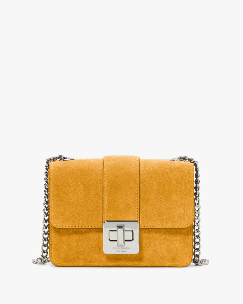 Kate Spade,Phoebe Suede Turnlock Mini Flap Crossbody,Suede,Crossbody,Mesh,Compact,Gold Metal,Day Party,Mustard