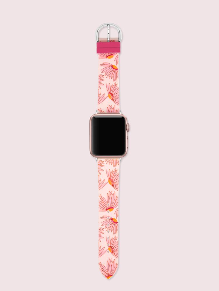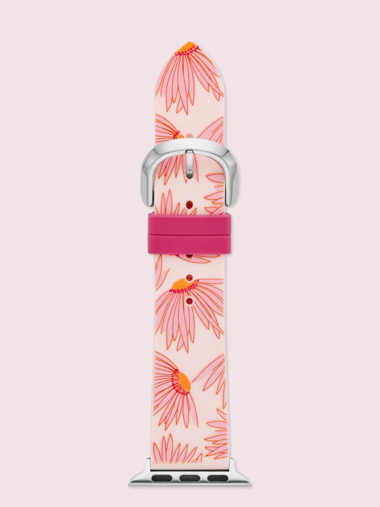 our pink silicone band will add an extra special touch to your Apple Watch®. detailed with a silver-tone buckle, it's made specifically for use with Apple Watch® Series 1 through 6 and fits both 38mm and 40mm styles. plus, the delicate floral finish will add a feminine touch to any outfit.