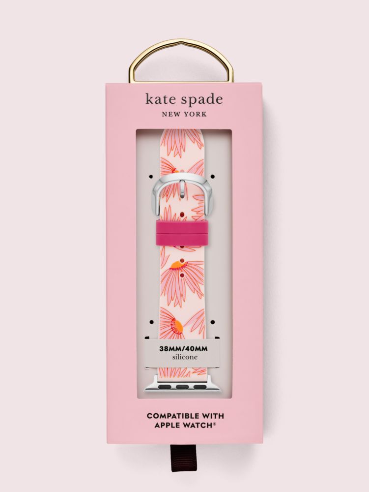 our pink silicone band will add an extra special touch to your Apple Watch®. detailed with a silver-tone buckle, it's made specifically for use with Apple Watch® Series 1 through 6 and fits both 38mm and 40mm styles. plus, the delicate floral finish will add a feminine touch to any outfit.