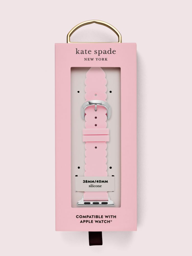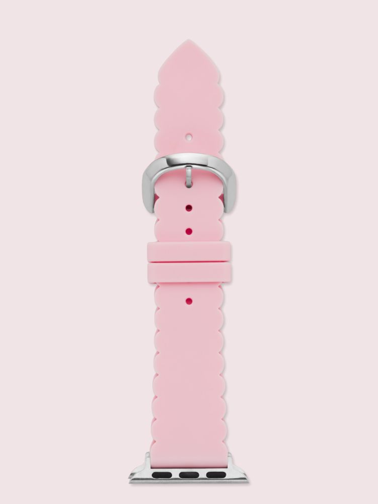 our matte pink silicone band will add an extra special touch to your Apple Watch®. detailed with a silver-tone buckle, it's made specifically for use with Apple Watch® Series 1 through 6 and fits both 38mm and 40mm styles. p.s. how cute are those scalloped edges?