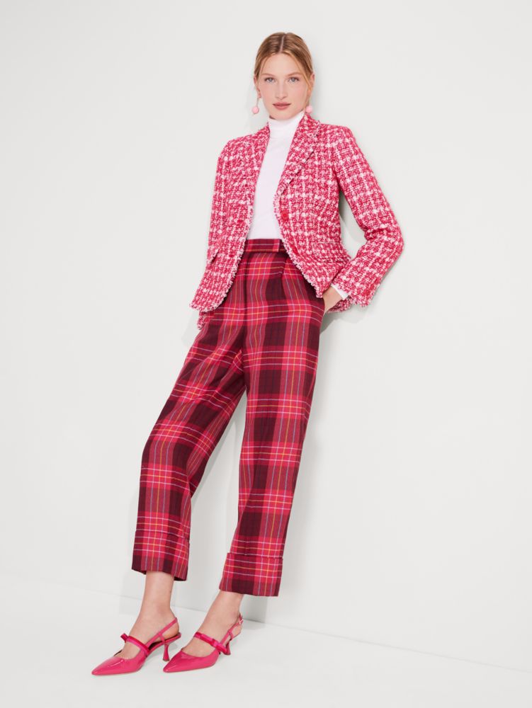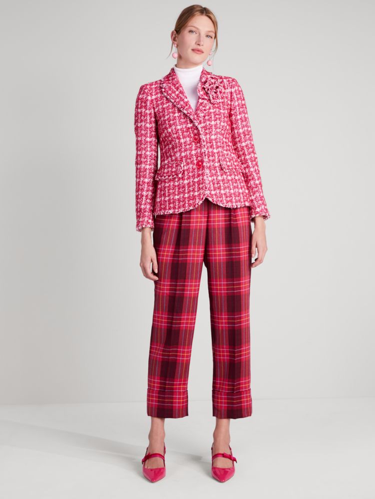 Photo shoot in the apple orchard! Capture a "candid" as you bite into a crisp Jonamac in this fallish plaid tweed blazer finished with a flower corsage.