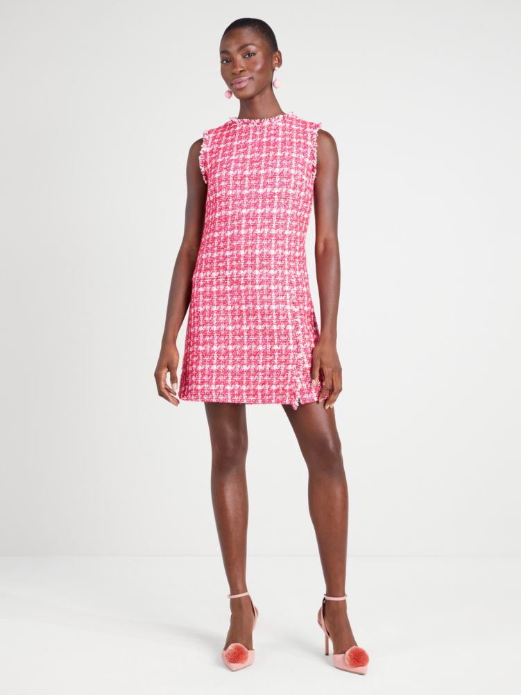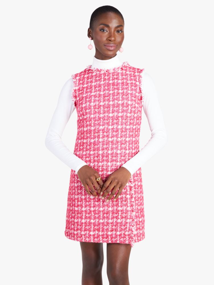 Say hi to this season's tweed dress: we did it in an autumnal red and pink, and added decorative self-fringe to boot.