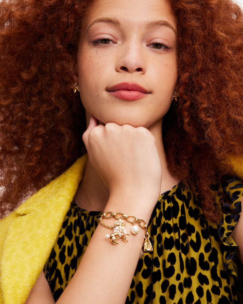 Take your furry friends with you wherever you go. Our new charm bracelet features polished pups with faux pearl embellishments.