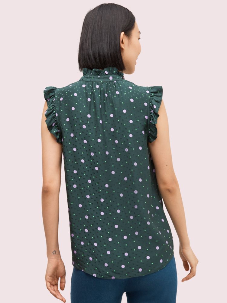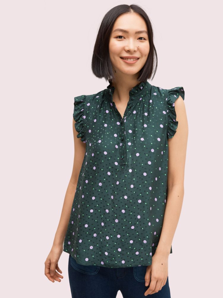 our luxe satin-back silk-blend crepe printed with lilac and green dots and woven with even more tonal ones for added texture. it almost feels like wearing confetti. (hello, new party shell.)