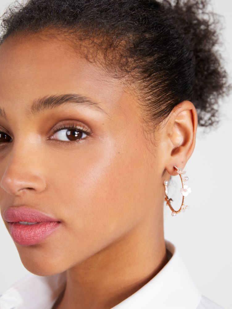 Scattered with mother-of-pearl pansies, acrylic pearls and lots of sparkle, these precious hoops are sure to elicit some oohs and ahhs from passersby...