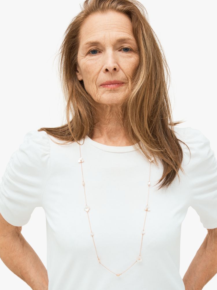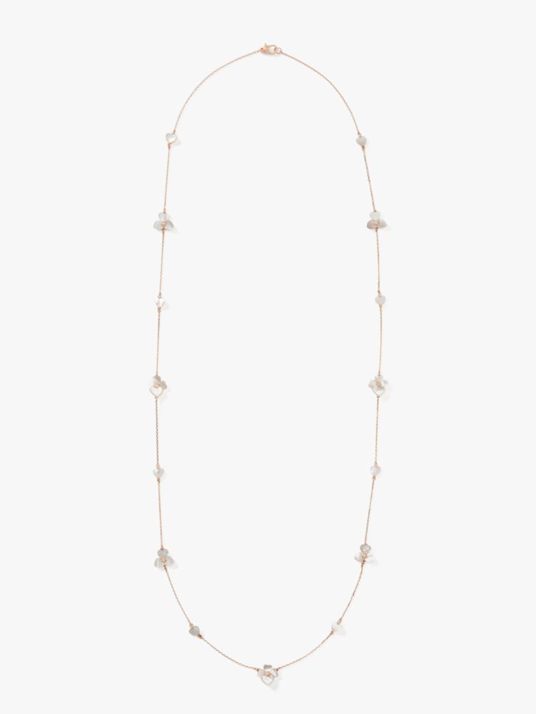 handcrafted of rose gold-tone metal and mother-of-pearl shell, our precious pansy collection is true to its name. and this scatter necklace is designed with lots of thoughtful details: like the sparkly crystal centers and heart-shaped petals. did you notice the larger ones? they're a nod to our signature mark.