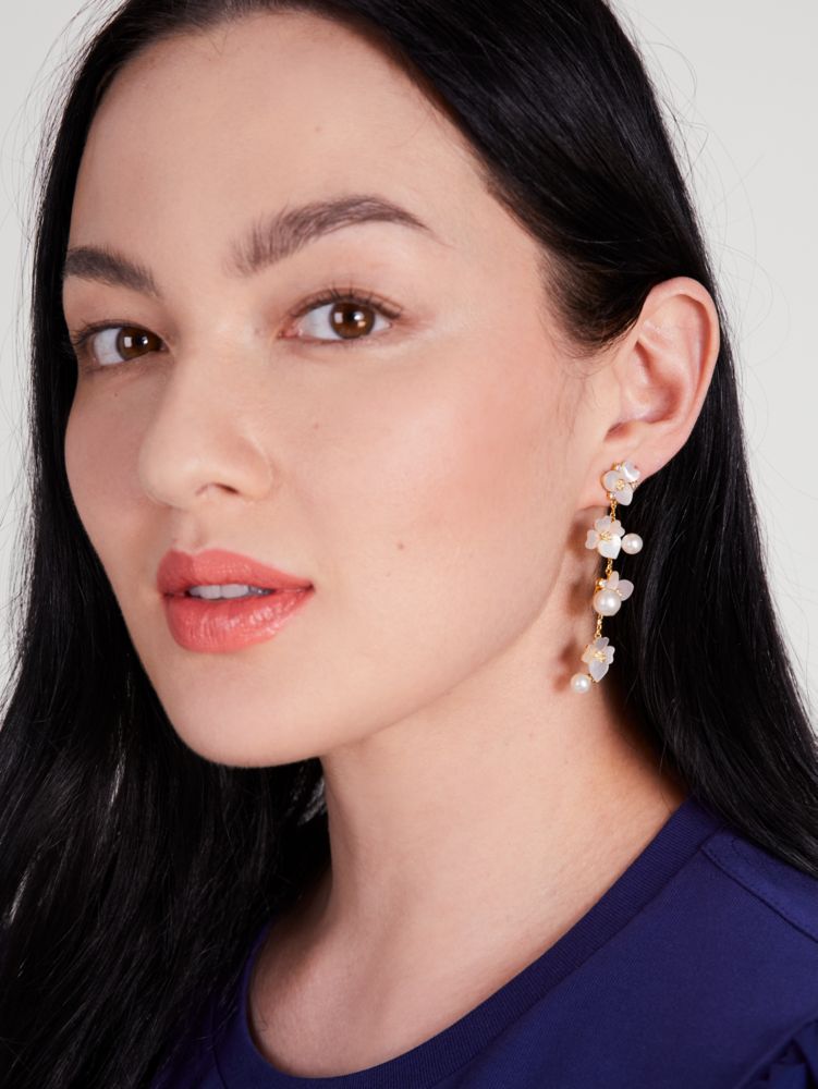 Strung with mother-of-pearl pansies, acrylic pearls and lots of sparkle, these precious linear earrings are sure to elicit some oohs and ahhs from passersby...