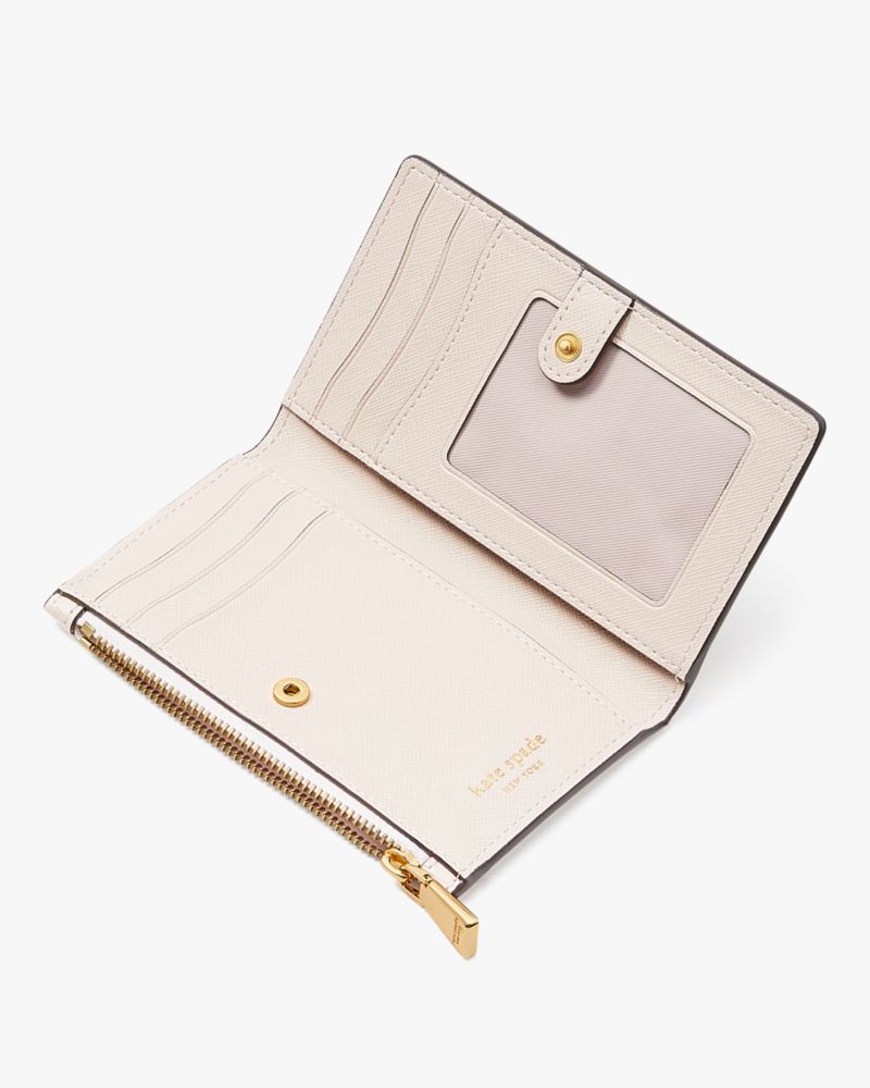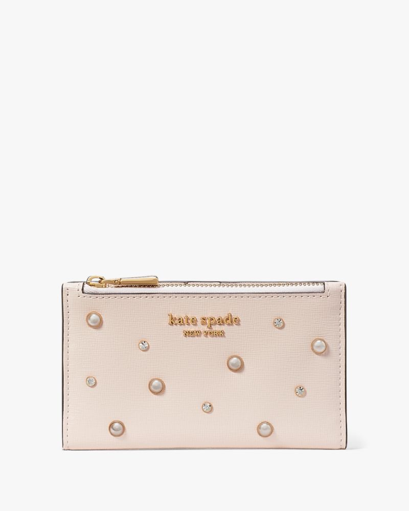 Equally pretty and practical, our Purl bifold wallet is crafted in scratch-resistant Saffiano leather and dotted with faux pearl beads.