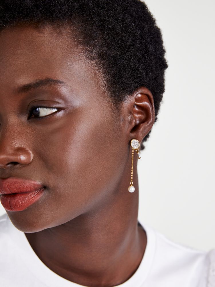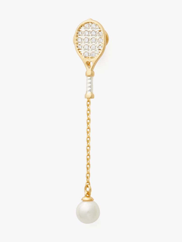 No doubt about it. In these linear earrings strung with golden racquets and pearls, you are most definitely queen of the court.