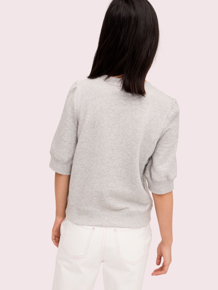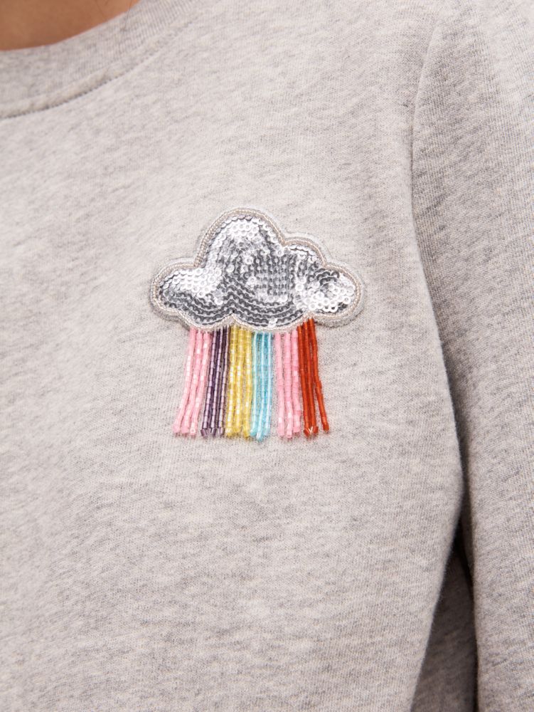 our rain or shine pullover is that cozy sweatshirt you'll be lounging in every chance you get. made of soft heathered grey cotton french terry, it's embellished at the chest with a metallic silver sequined rain cloud patch. and if you zoom in, you'll see the rain drops are made from tiny colorul beads.