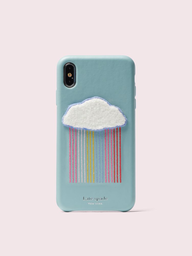 this pretty blue phone case, made from the most supple leather, is appliquéd with a fluffy rain cloud patch and embroidered with rain showers in multicolored thread. the mix of textures makes it really fun to touch. also important: it provides a layer of protection against scratches and those inevitable drops.