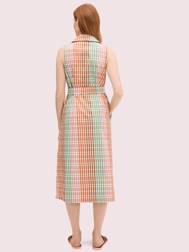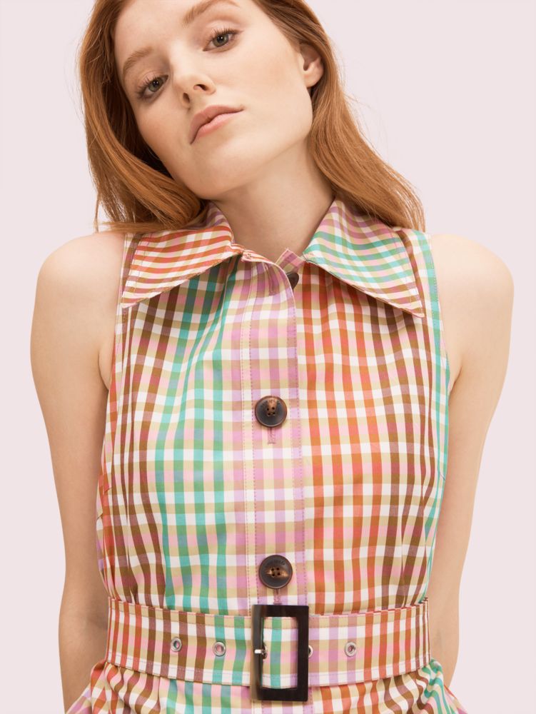 our nod to the timeless trench coat. see: the classic details like a self-tie belt (we love it knotted in a loop like a traditional trench) and tortoiseshell buttons. we finished this shirtdress with our custom rainbow plaid pattern for a playful twist.