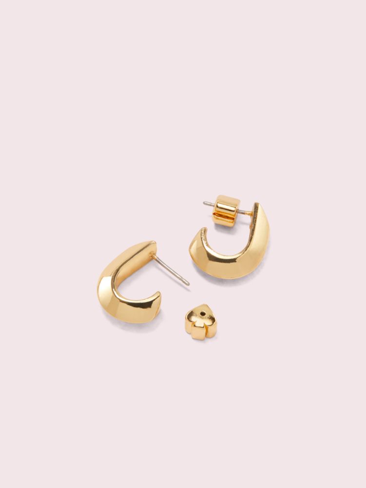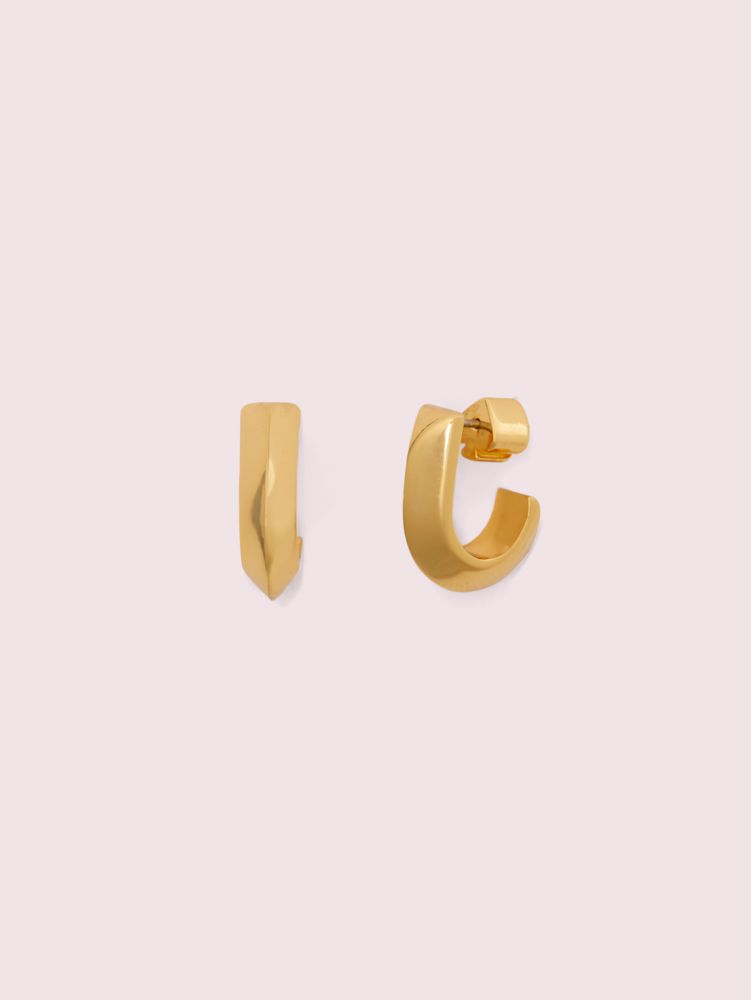 our raise the bar collection gets a sparkling update for fall with pavé detailing. handcrafted of 12k gold-plated metal, these small faceted mini hoops will instantly elevate all your dresses and blouses or tees and sweatshirts. also important: we made the backs in the shape of our signature mark.
