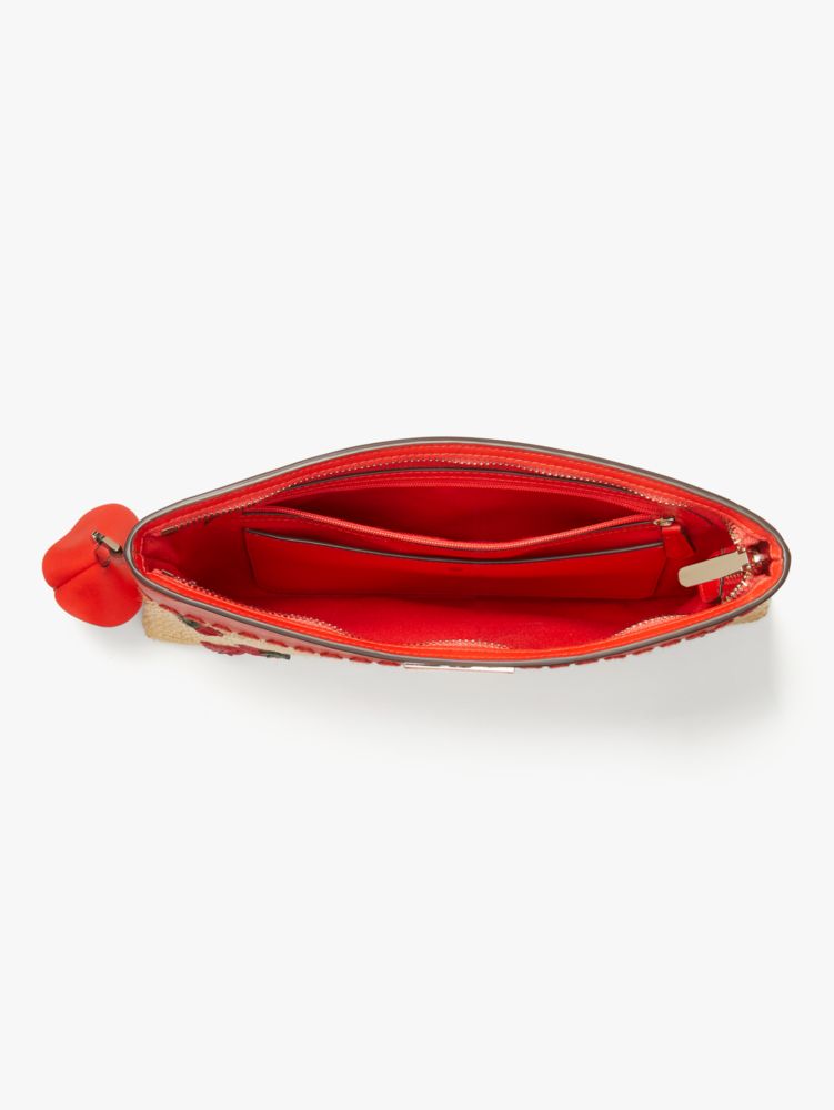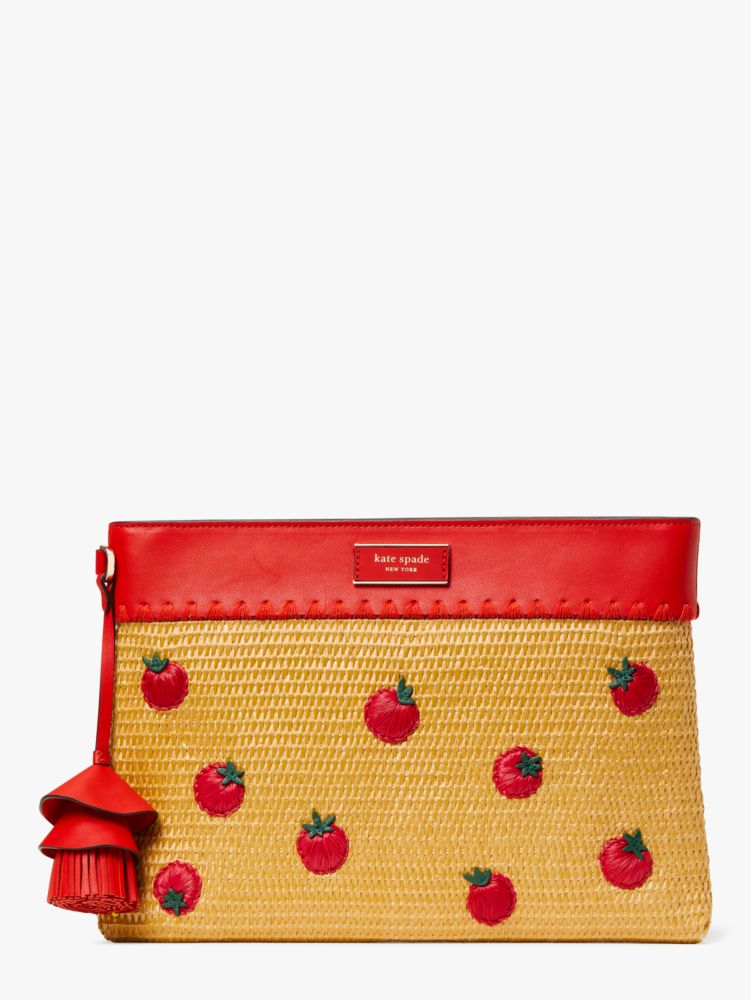Intricately woven in straw, our Roma clutch is embellished with juicy tomato motifs for a delicious nod to the summer harvest.